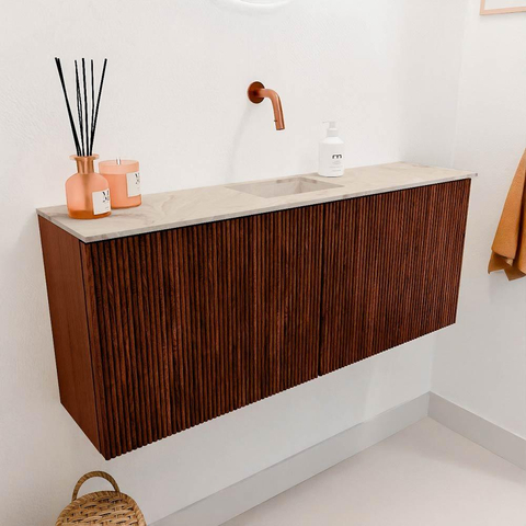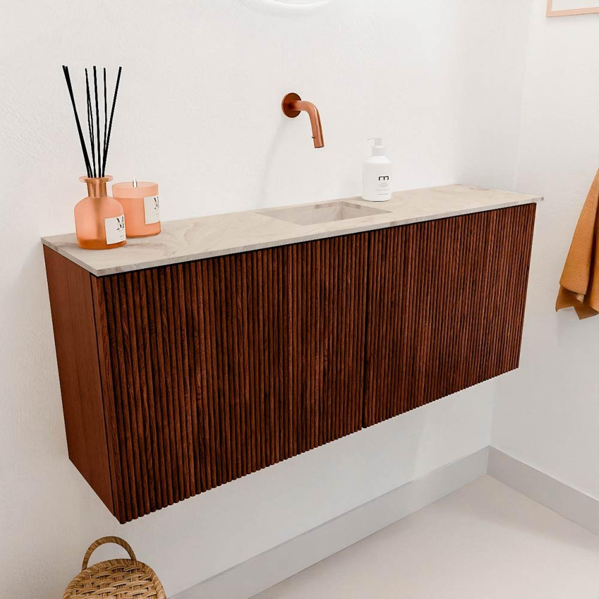 Ce meuble se distingue immédiatement par sa couleur Ruby élégante, qui ajoute chaleur et caractère à chaque espace. L'aspect bois naturel combiné au design épuré offre une apparence intemporelle qui s'adapte facilement à divers styles d'intérieur. La vasque couleur Frappe s'harmonise parfaitement avec le meuble et ajoute une teinte douce et neutre qui apporte calme et équilibre. Avec ce meuble, vous donnez à vos toilettes une allure luxueuse sans qu'elle soit écrasante. Le subtil jeu de couleurs et la conception moderne en font un véritable point focal, qui donne ce petit plus à votre salle de bains.