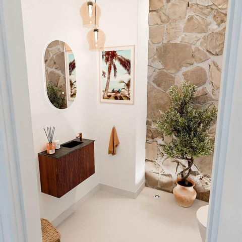 Avec une profondeur de 24,5 cm et une hauteur de 40 cm, ce meuble est compact mais étonnamment spacieux. La vasque avec un trou de robinet à droite offre suffisamment d'espace pour se laver confortablement, tandis que le meuble lui-même offre suffisamment de rangement pour tous vos accessoires de salle de bains. La fixation murale crée un effet flottant, ce qui agrandit visuellement l'espace et facilite grandement le nettoyage. Ainsi, vous combinez facilement style et commodité pratique.