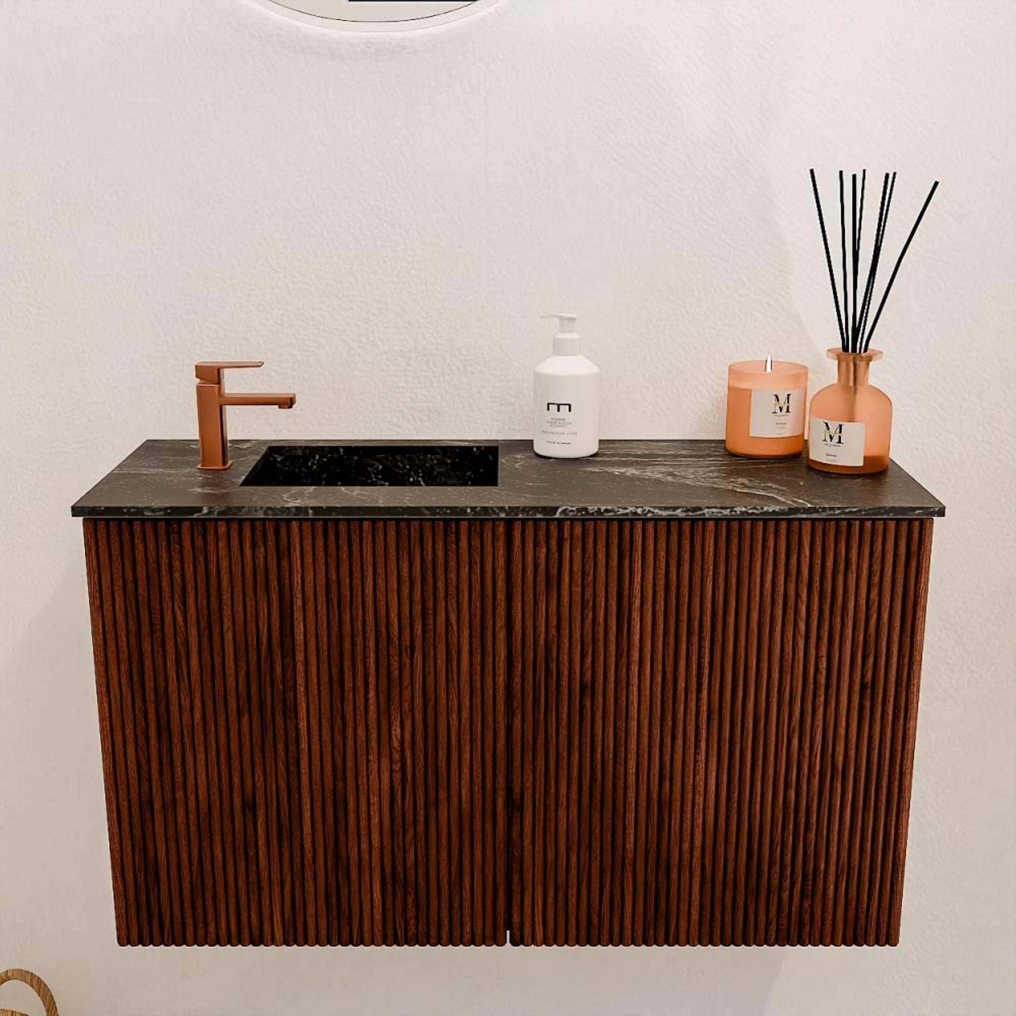 Avec sa couleur chaude Ruby et les rainures verticales sur les façades, ce meuble est un véritable accroche-regard. L'utilisation de chêne massif à l'avant assure une apparence naturelle et luxueuse, tandis que la finition fine avec placage de chêne sur les côtés donne au meuble un aspect raffiné. Ce meuble s'intègre parfaitement dans les salles de bains modernes comme classiques et élève l'ambiance à un niveau supérieur. Par les détails subtils et les matériaux de haute qualité, le meuble dégage qualité et exclusivité, faisant de votre salle de bains un lieu dont vous pouvez être fier.