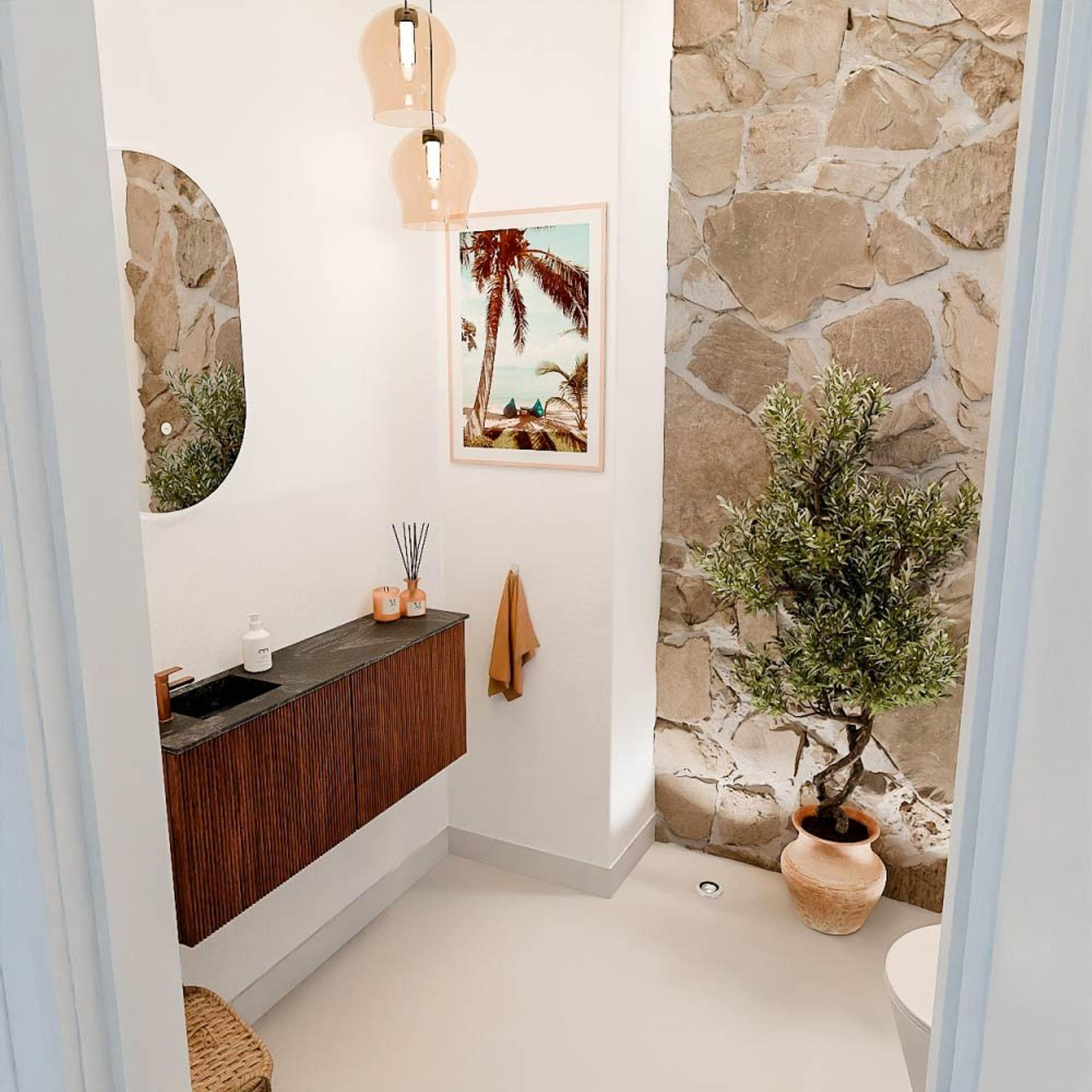 Le meuble se distingue immédiatement par sa couleur Ruby profonde et riche qui ajoute chaleur et élégance à votre salle de bains. La combinaison avec la vasque noire Lava crée un contraste moderne tout en restant intemporel. Grâce à l'utilisation de chêne massif pour les façades et de placage chêne sur les côtés, le meuble dégage un luxe naturel. Cela fait que votre salle de bains ne soit pas seulement belle, mais aussi accueillante, où vous vous sentirez complètement chez vous. Avec ce meuble, vous apportez une pièce design qui donne à votre salle de bains une apparence exclusive.