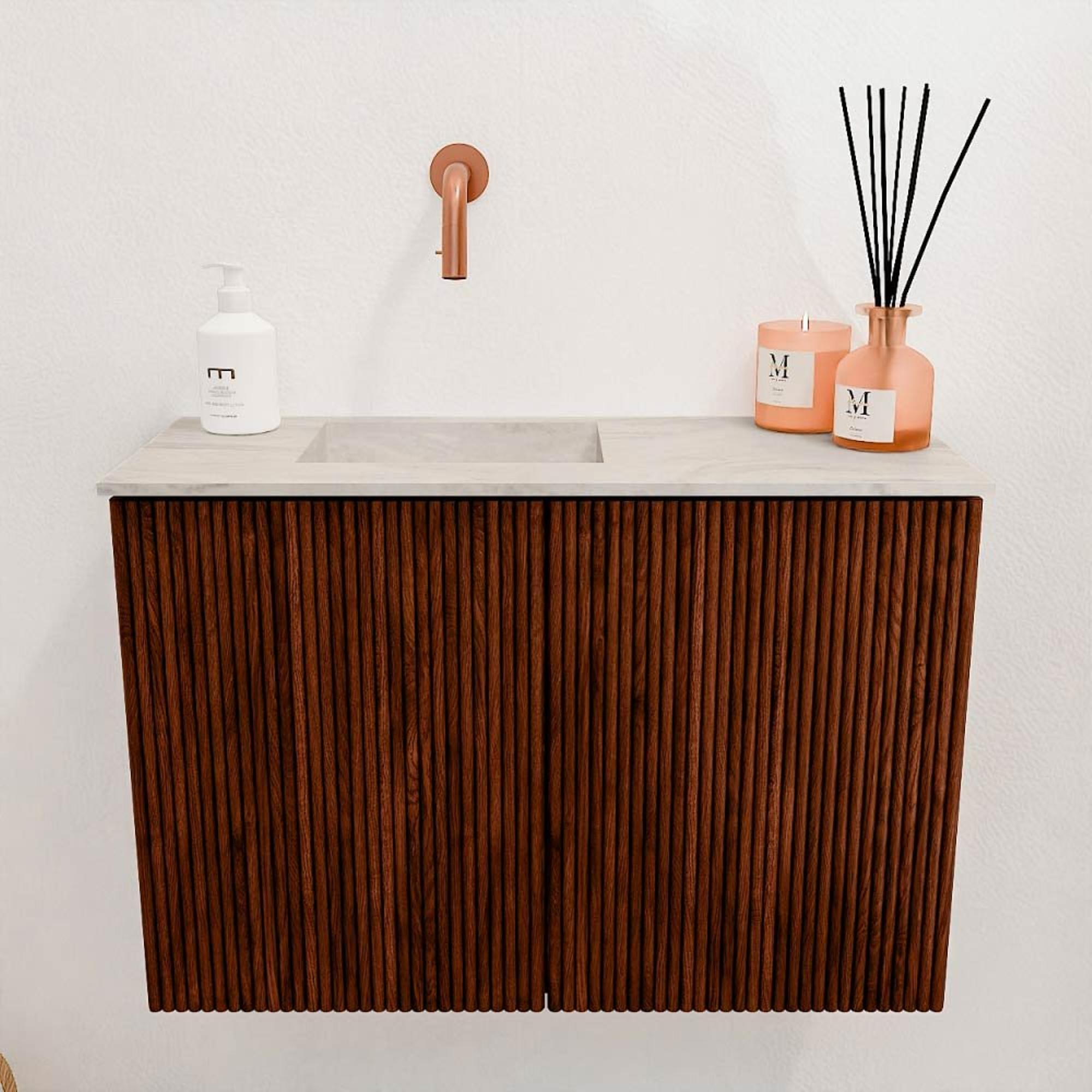Avec une largeur de 60 cm et deux portes pratiques, ce meuble offre suffisamment d'espace de rangement pour garder tous vos articles de toilette bien rangés et organisés. La vasque est placée à gauche, ce qui assure une disposition intelligente qui économise de l'espace tout en étant pratique. L'absence de trou de robinet vous donne la liberté de choisir un robinet qui correspond parfaitement à votre style et à votre confort d'utilisation. Ainsi, vous faites de vos toilettes un endroit à la fois beau et efficace.