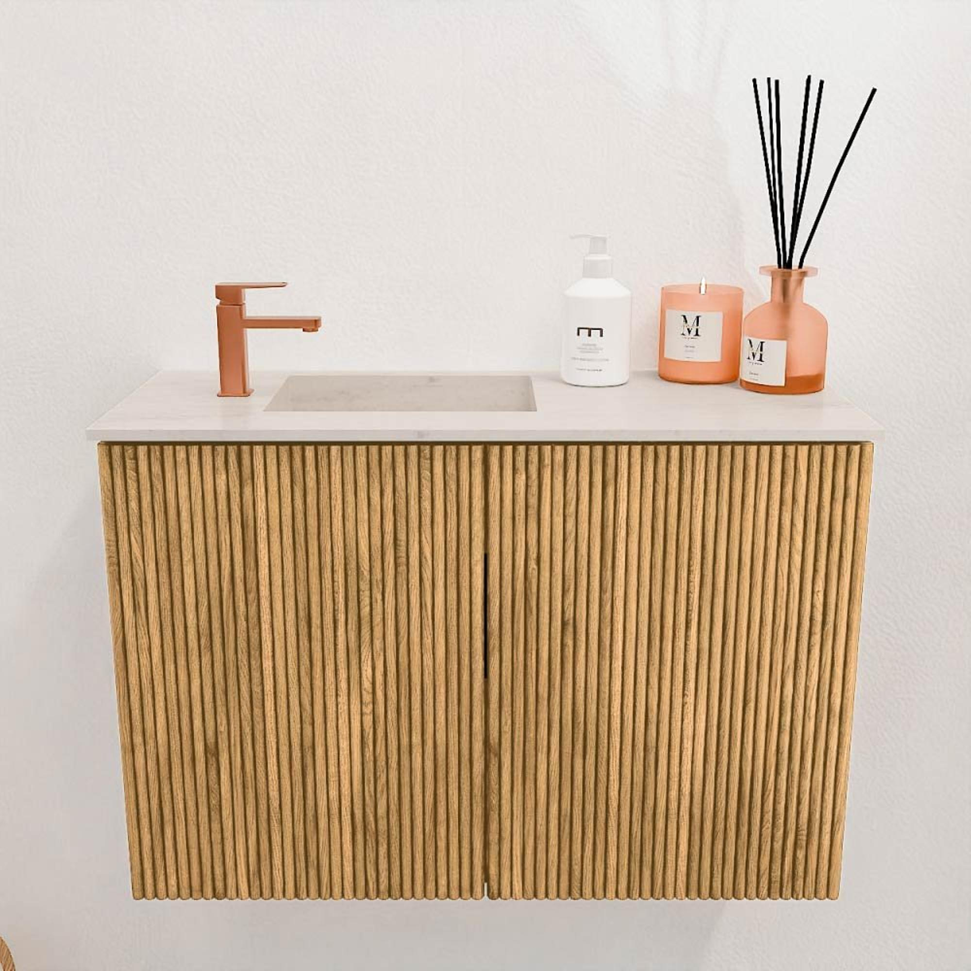 Le meuble se distingue immédiatement par sa couleur chêne chaude qui crée une atmosphère naturelle et accueillante. Les lignes épurées et le design minimaliste s'intègrent facilement dans les salles de bains modernes comme classiques. Grâce à la structure subtile du bois, votre salle de bains acquiert un aspect authentique sans être trop chargée. Ce meuble est un véritable point focal qui donne à votre salle de bains une apparence luxueuse et soignée. L'association avec la vasque Corian de haute qualité complète l'ensemble et assure un design intemporel dont vous profiterez pendant des années.