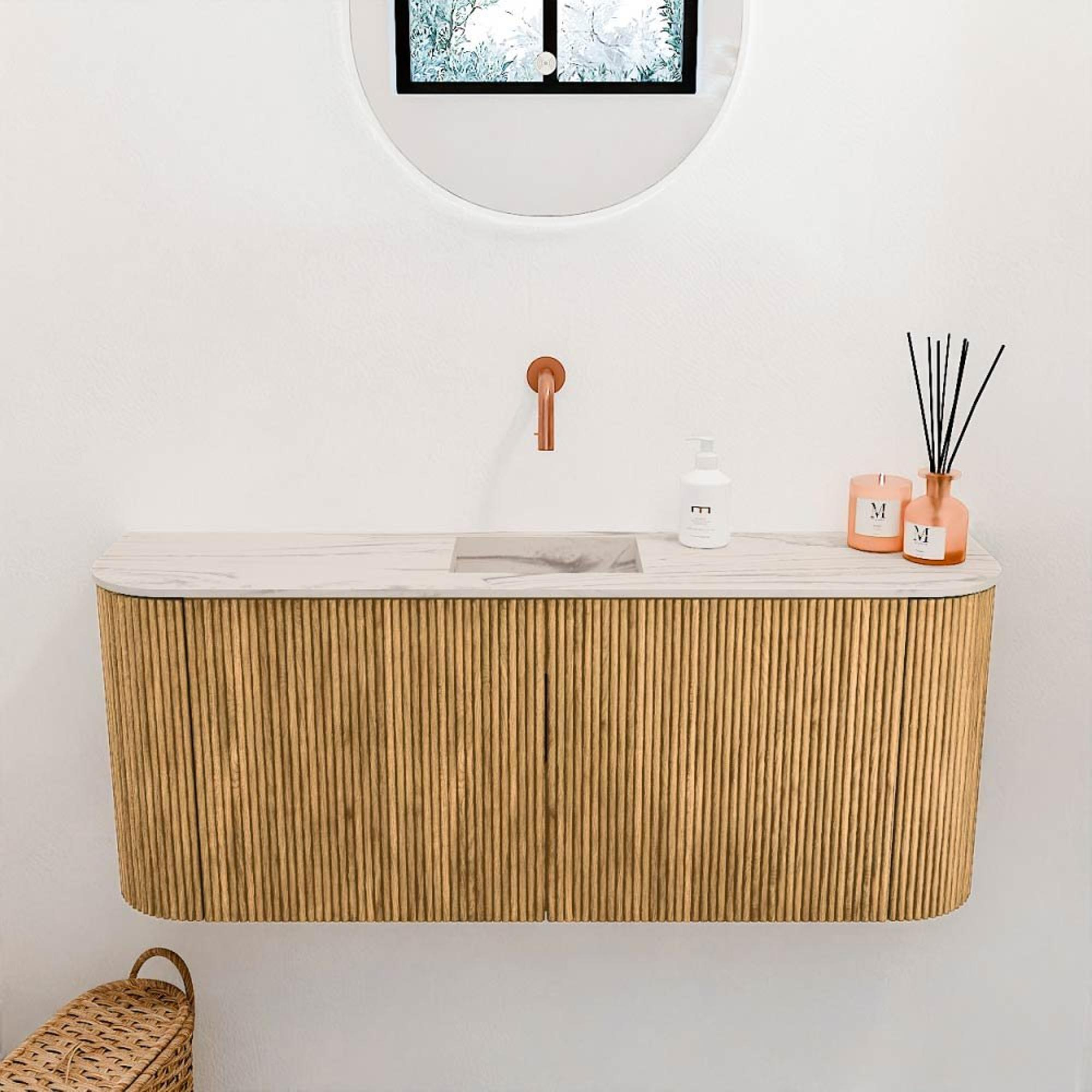 La finition en chêne naturel avec une couleur chaude nata donne à votre salle de bains une apparence authentique et luxueuse. Les formes arrondies des deux côtés apportent un look doux et accueillant qui distingue ce meuble des meubles de salle de bains standards. Grâce à son design épuré mais organique, le meuble s’intègre facilement dans divers styles d’intérieur, du moderne au rustique. Vous profitez ainsi non seulement d’un meuble fonctionnel, mais aussi d’un véritable élément décoratif qui donne une atmosphère unique à votre salle de bains.