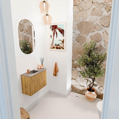 La finition oak chaude donne au meuble un aspect naturel et accueillant qui s'harmonise facilement avec divers styles d'intérieur. La forme ronde sur le côté droit ajoute un détail ludique et élégant, faisant du meuble un véritable point focal. Ce design garantit que votre salle de bains n'est pas seulement fonctionnelle, mais aussi un endroit dont vous êtes fier. Grâce à la couleur et à la forme subtiles, le meuble s'accorde parfaitement avec des matériaux de salle de bains clairs ou foncés, vous offrant ainsi une grande liberté dans votre aménagement.