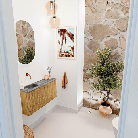 La combinaison de chêne massif et de placage de chêne confère à ce meuble un aspect intemporel et naturel qui s'intègre sans effort dans différents styles d'intérieur. La couleur chaude Oak crée une ambiance chaleureuse, tandis que la forme épurée ajoute une touche moderne. Grâce au contraste subtil de couleur avec le lavabo en Sombra, un ensemble harmonieux attire immédiatement l'attention. Ce meuble élève votre salle de bains à un niveau supérieur et transforme un espace simple en un lieu élégant dont vous êtes fier.