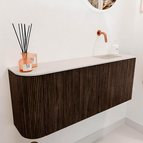 Avec ce magnifique meuble, vous donnez immédiatement à votre salle de bains une ambiance chaleureuse et naturelle. Le jeu subtil de lignes et l'élégant arrondi sur le côté gauche en font un véritable point focal, tandis que l'agencement pratique offre suffisamment d'espace de rangement. Grâce à la finition de haute qualité dans une riche couleur noyer, le meuble ne donne pas seulement une impression de luxe, mais s'intègre également parfaitement dans divers styles d'intérieur. La vasque assortie, avec sa forme moderne et épurée et sa position à droite, complète l'ensemble sans trous de robinet inutiles. Vous créez ainsi une atmosphère harmonieuse et apaisante dans laquelle vous commencez et terminez chaque jour avec plaisir.