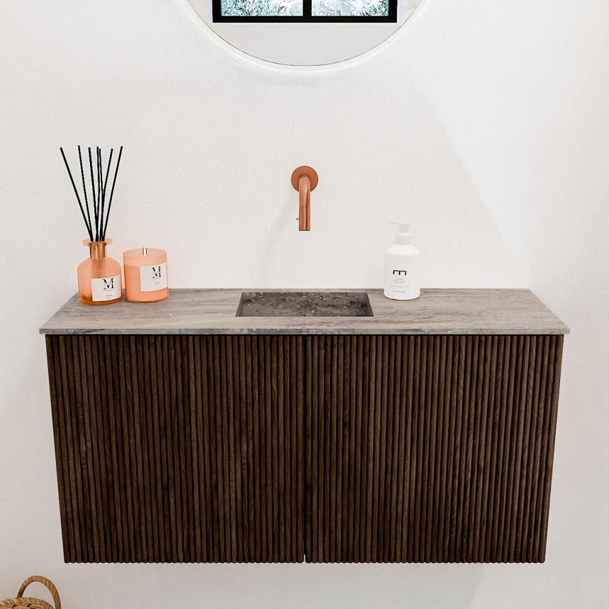 La combinaison de bois de chêne massif à l'avant et de placage chêne couleur noyer sur les côtés offre un aspect intemporel et élégant. Les rainures verticales donnent au meuble une touche raffinée et moderne qui s'harmonise facilement avec différents styles d'intérieur. Ce meuble n'est pas simplement un élément fonctionnel, mais un véritable point focal qui améliore votre salle de bains. Grâce aux tons chauds du bois, l'espace paraît immédiatement accueillant et naturel, contribuant à une atmosphère détendue.