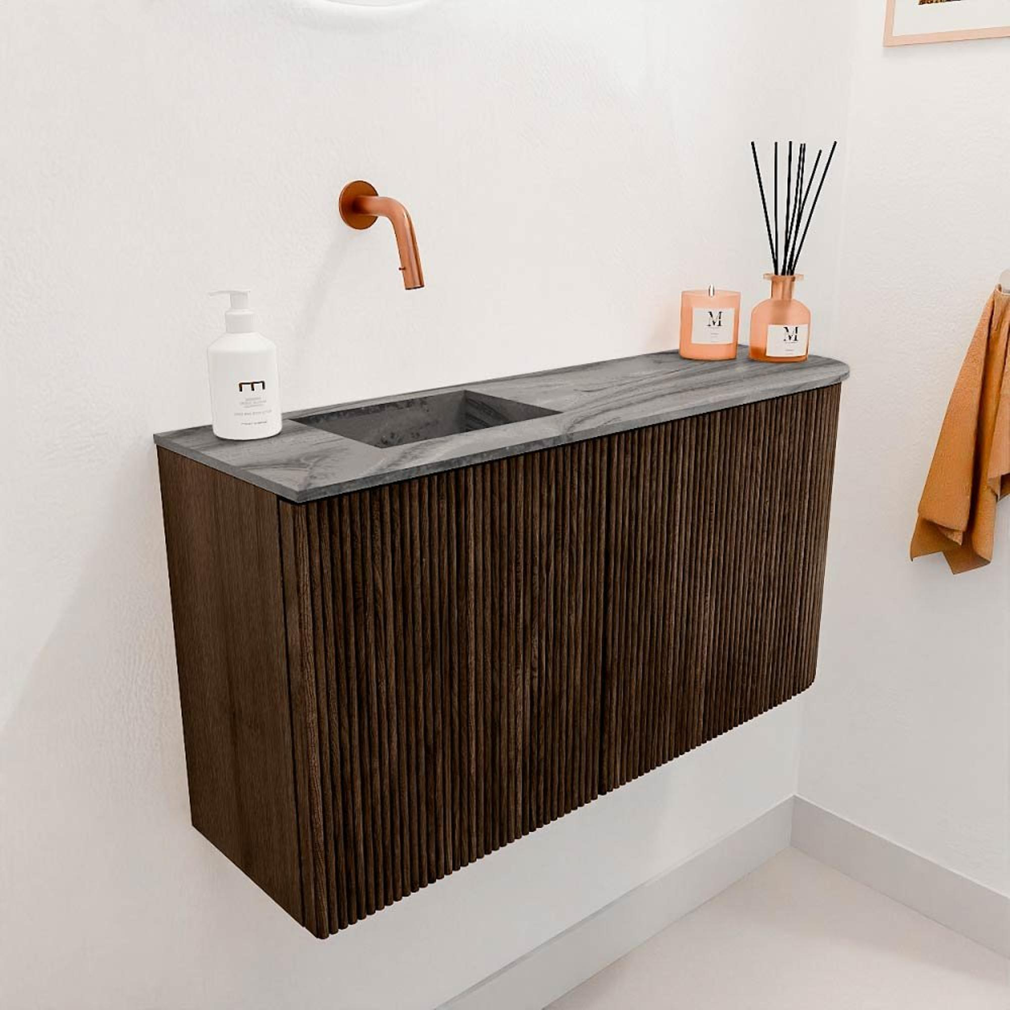 Mondiaz JOYA-DLUX Meuble de salle de bains 81,6cm - arrondi droit couleur Noyer - Vasque FAYE position Gauche Sans trou de robinet couleur Sombra