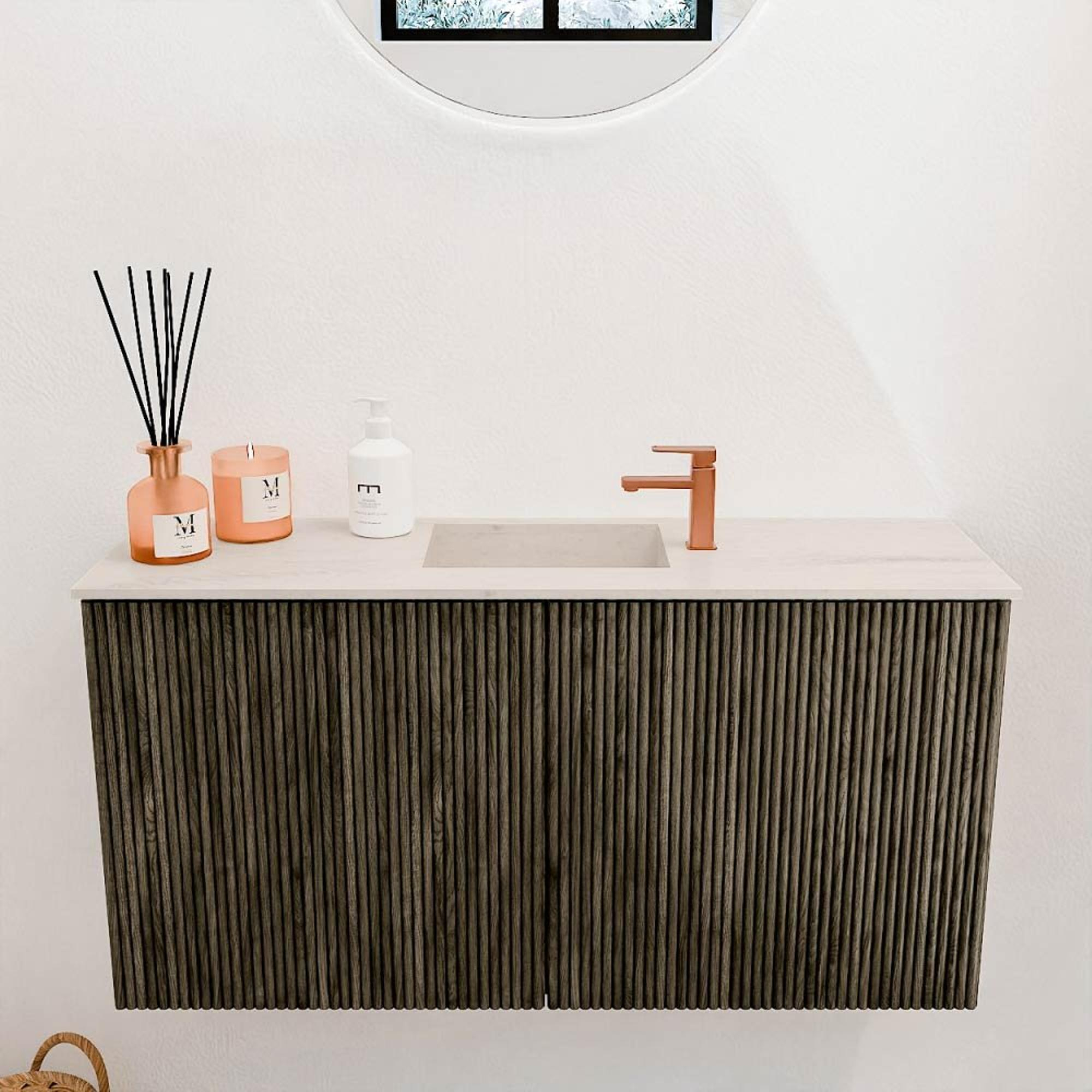 - Modèle de vasque Faye en couleur Meli, 81 cm de large et 1,2 cm de haut – position centrale avec 1 trou de robinet