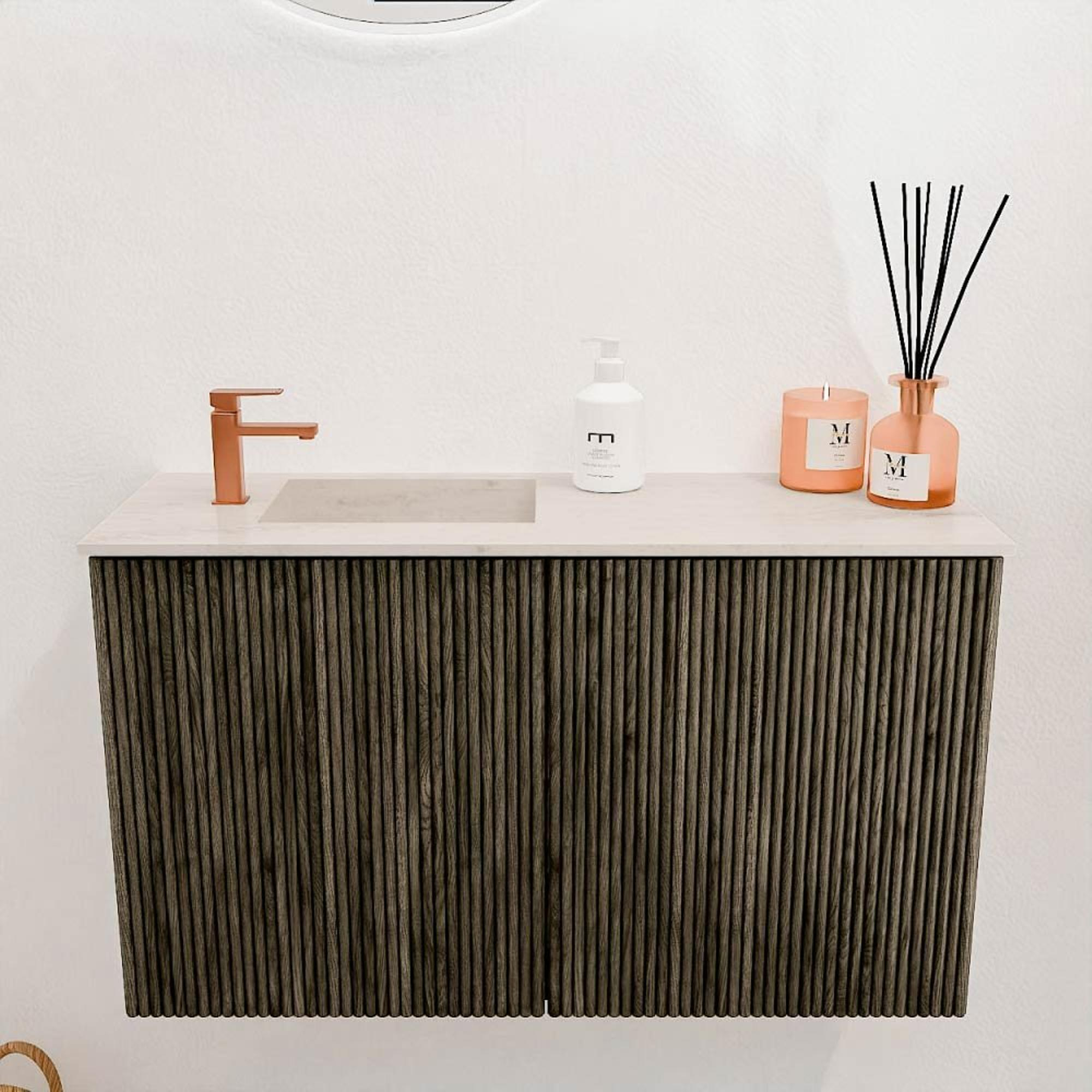 La structure naturelle du bois massif de chêne à l'avant donne au meuble un aspect intemporel et élégant. La couleur Shadow ajoute une teinte moderne et sombre qui s'harmonise facilement avec différents styles de salle de bains. Les rainures verticales dans le design confèrent au meuble un look subtil mais distinctif qui donne ce petit plus à votre salle de bains. Ce meuble n'est pas simplement un élément fonctionnel, mais une partie élégante de votre intérieur dont vous pouvez être fier.