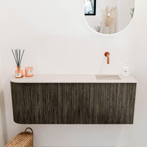Avec ce magnifique meuble, vous donnez immédiatement à votre salle de bains une ambiance chaleureuse et naturelle. Il allie savoir-faire et design moderne, ce qui le rend non seulement fonctionnel, mais aussi un véritable point focal dans votre espace. Grâce à l'arrondi subtil sur le côté gauche, le meuble acquiert un caractère unique qui confère à votre salle de bains une atmosphère douce et accueillante. La combinaison de la couleur profonde Shadow avec le plan vasque clair Meli crée un contraste harmonieux qui dégage calme et style. Ce meuble est idéal pour ceux qui aiment un aménagement épuré mais chaleureux dont ils profitent chaque jour avec plaisir. Grâce à la fixation murale, l'espace paraît plus vaste et le sol reste facile à nettoyer. Vous profitez ainsi non seulement d'un beau meuble, mais aussi d'une expérience de salle de bains pratique et confortable.