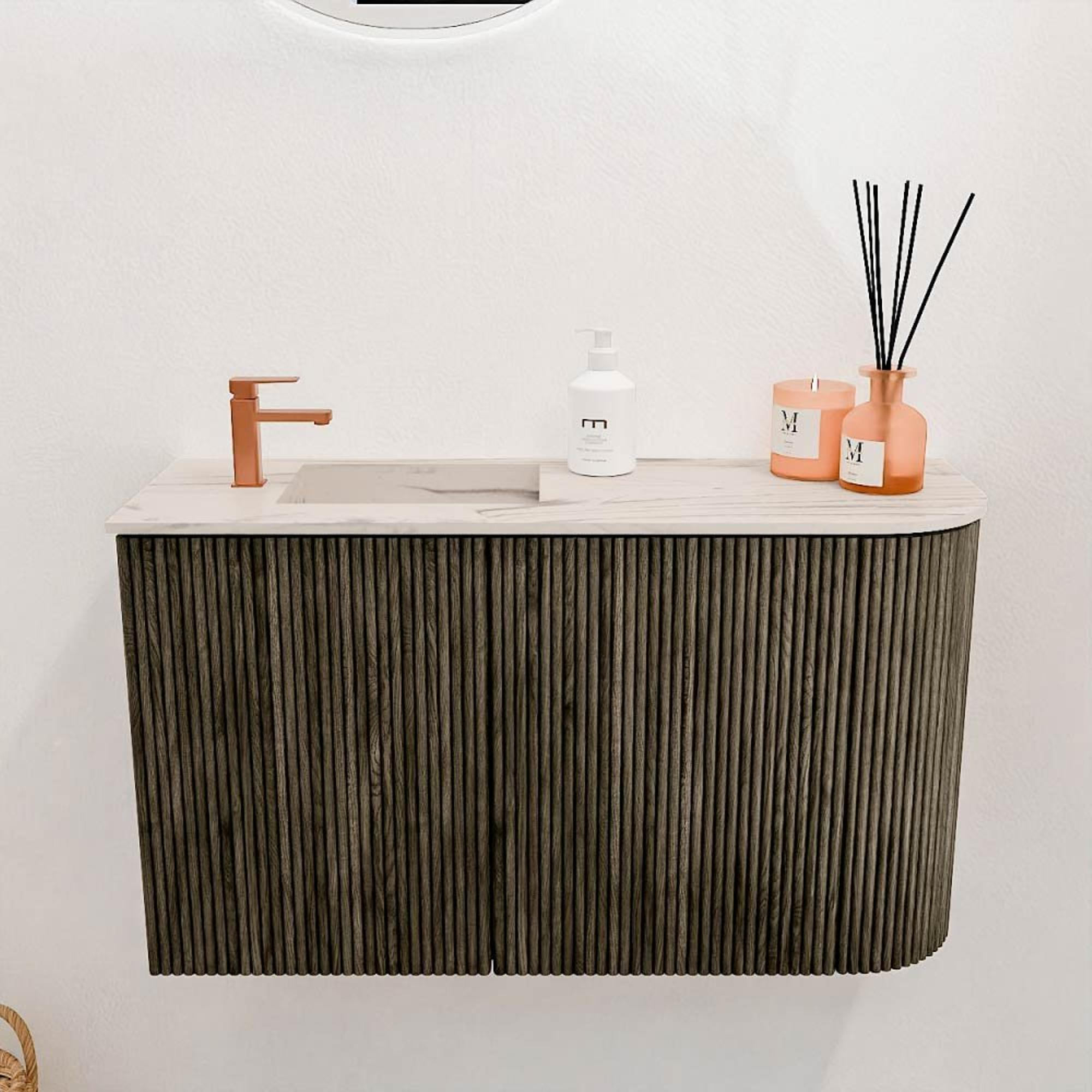 Ce meuble se distingue par son design élégant avec un arrondi subtil à droite, ce qui lui confère un caractère unique et moderne. La couleur Shadow offre une apparence chaude et naturelle qui s'harmonise facilement avec divers styles de salle de bains. La vasque en couleur Nata ajoute une nuance claire et fraîche qui équilibre l'ensemble. Cette combinaison crée une harmonie qui donne à votre salle de bains une apparence luxueuse et contemporaine. Vous profitez ainsi non seulement d'un meuble fonctionnel, mais aussi d'un véritable élément décoratif qui élève votre salle de bains à un niveau supérieur.