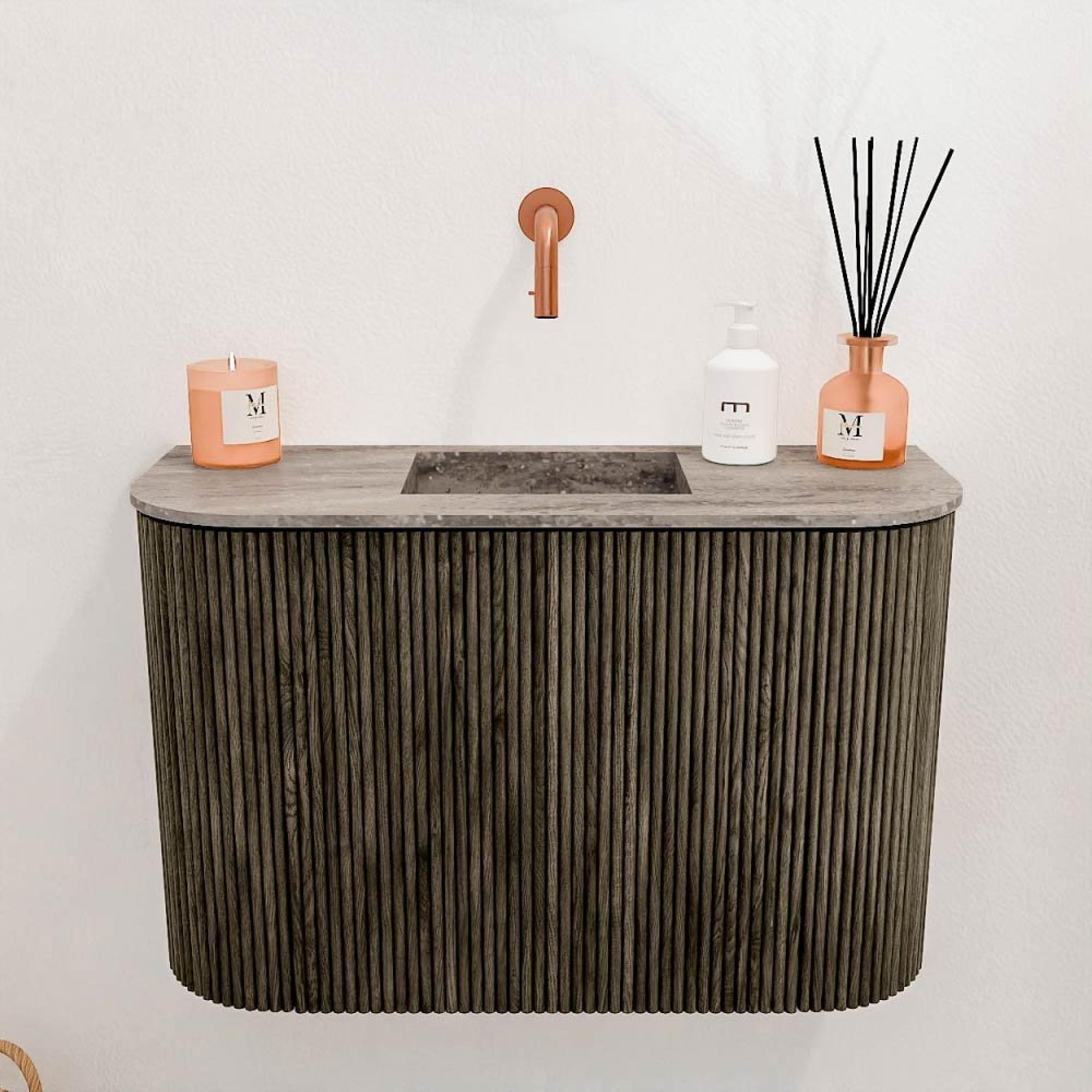 La combinaison de la couleur Shadow profonde et de la vasque chaude Oza confère à ce meuble un aspect intemporel et exclusif. Les courbes subtiles des deux côtés créent un design doux et élégant qui attire immédiatement l'attention. Ce meuble est un véritable point focal dans votre salle de bains, sans être envahissant. Grâce à l'utilisation de chêne massif avec des rainures verticales, le meuble dégage savoir-faire et qualité. Vous ajoutez ainsi non seulement un élément fonctionnel, mais aussi une pièce maîtresse élégante qui donne à votre salle de bains une allure luxueuse.