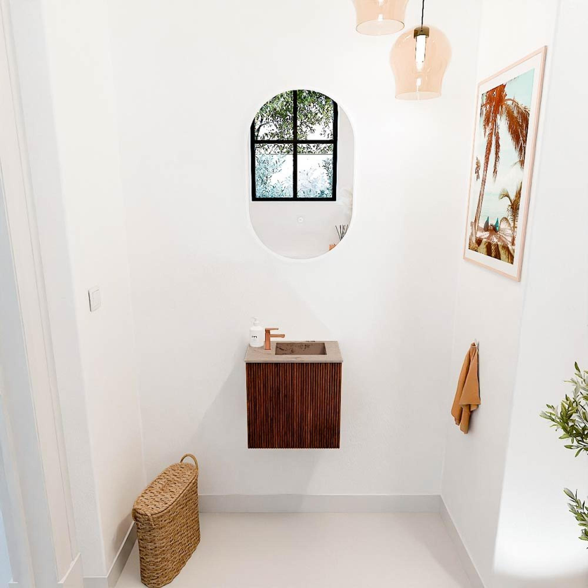 Avec ce meuble compact et élégant, vous donnez immédiatement un coup de neuf à vos toilettes invités. Il combine une couleur Ruby chaude et riche avec une vasque contemporaine dans la teinte douce Arena, ce qui confère à l'ensemble une apparence accueillante et soignée. Grâce à ses dimensions intelligentes de 40 cm de large, le meuble s'adapte parfaitement aux petits espaces sans sacrifier le confort. La vasque avec trou de robinet sur le côté droit rend l'utilisation particulièrement pratique, tandis que les lignes épurées et la finition de haute qualité créent une ambiance moderne et soignée. Ainsi, vous transformez facilement votre coin salle de bains en un endroit dont vous êtes fier et qui surprendra également vos invités.