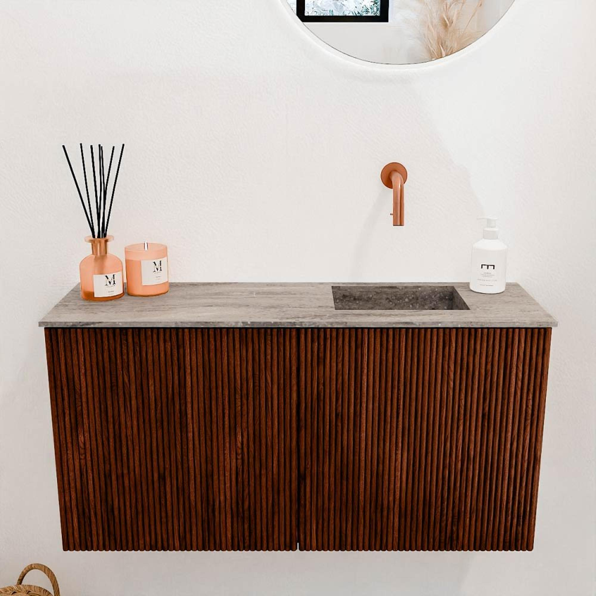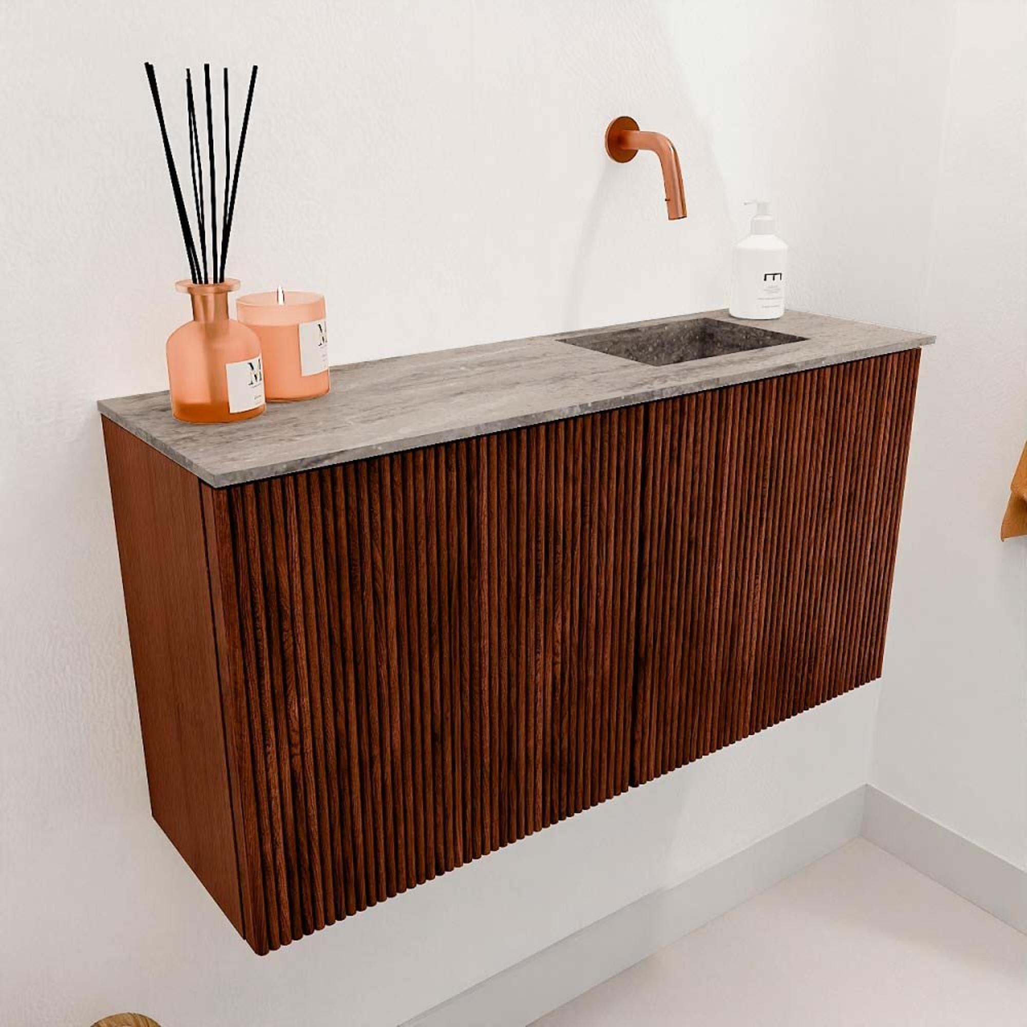 La couleur Ruby profonde combinée aux rainures verticales donne à ce meuble une apparence unique et élégante. C'est un véritable point fort qui apporte immédiatement une ambiance chaleureuse et luxueuse à votre salle de bains. Grâce au design intemporel, il s'intègre sans effort dans les intérieurs modernes comme classiques. Avec ce meuble, vous choisissez un élément stylé qui donne une touche personnelle à votre salle de bains sans dominer.