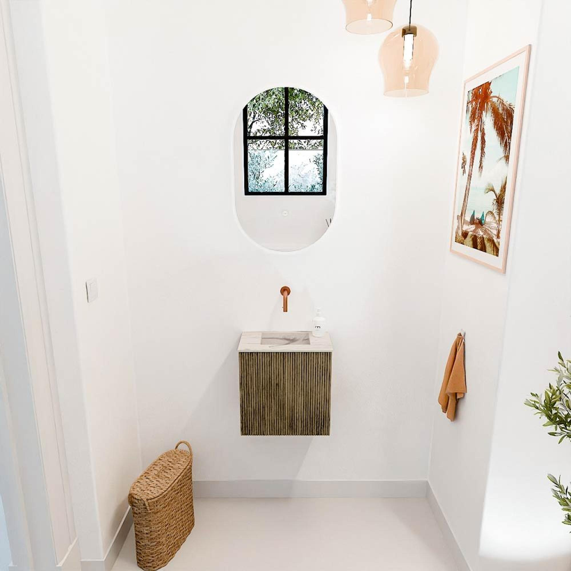 Le design de ce meuble est moderne et minimaliste, avec une couleur subtile qui s'harmonise facilement avec différents styles d'intérieur. La combinaison de la couleur Dusk avec la vasque claire en Nata crée un beau contraste qui attire immédiatement l'œil. Grâce aux lignes épurées et au format compact, l'espace paraît plus grand et plus calme. Ce meuble est un véritable point focal qui donne à vos toilettes d'invités une apparence luxueuse sans dominer.