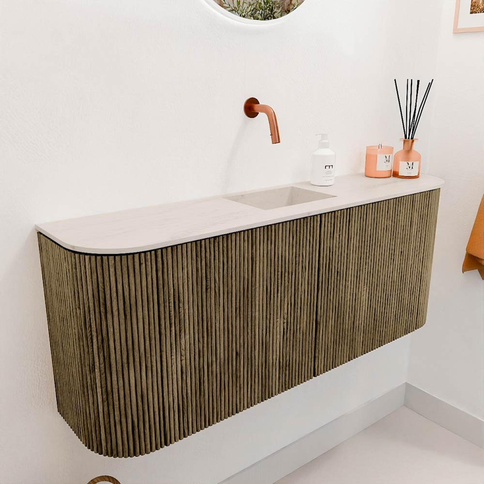Le meuble se distingue immédiatement par son design raffiné avec des formes arrondies des deux côtés, ce qui lui confère une apparence unique et douce. La combinaison de chêne massif et de placage chêne couleur Dusk assure un look chaleureux et naturel tout en étant moderne. Ainsi, le meuble s'intègre facilement dans différents styles de salle de bains, du classique au contemporain. Avec ce meuble, vous ajoutez une touche de luxe à vos toilettes d'invités, en faisant un endroit dont vous serez fier. La vasque couleur Meli s'accorde parfaitement et complète l'ensemble avec une touche subtile et élégante.