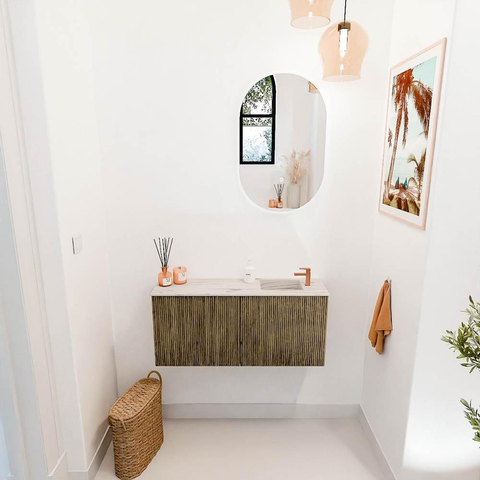 La combinaison de chêne massif à l'avant et de placage de chêne sur les côtés confère à ce meuble un aspect naturel et luxueux. Les rainures verticales sur les façades ajoutent un détail subtil mais remarquable qui donne au meuble un look contemporain et raffiné. Grâce à la couleur chaude Dusk, le meuble s'intègre parfaitement dans les salles de bains modernes comme classiques. Vous créez ainsi un espace convivial où vous prenez plaisir à passer chaque jour. La vasque en couleur douce Nata s'harmonise parfaitement et assure un ensemble harmonieux. Avec ce meuble, vous optez pour un design intemporel qui reste beau pendant des années.