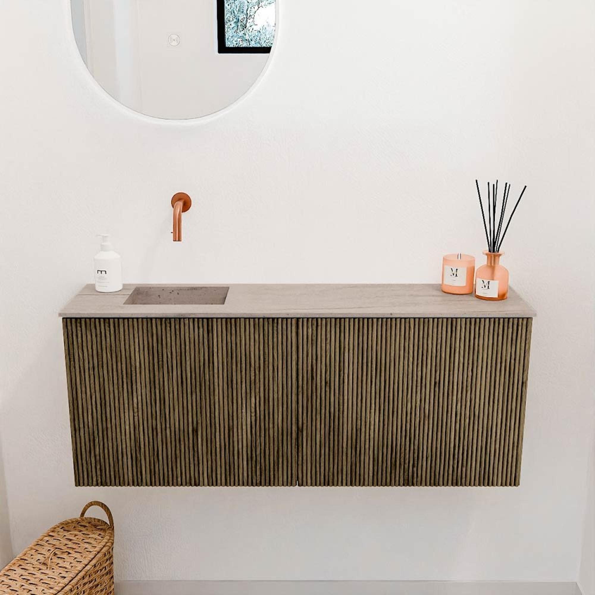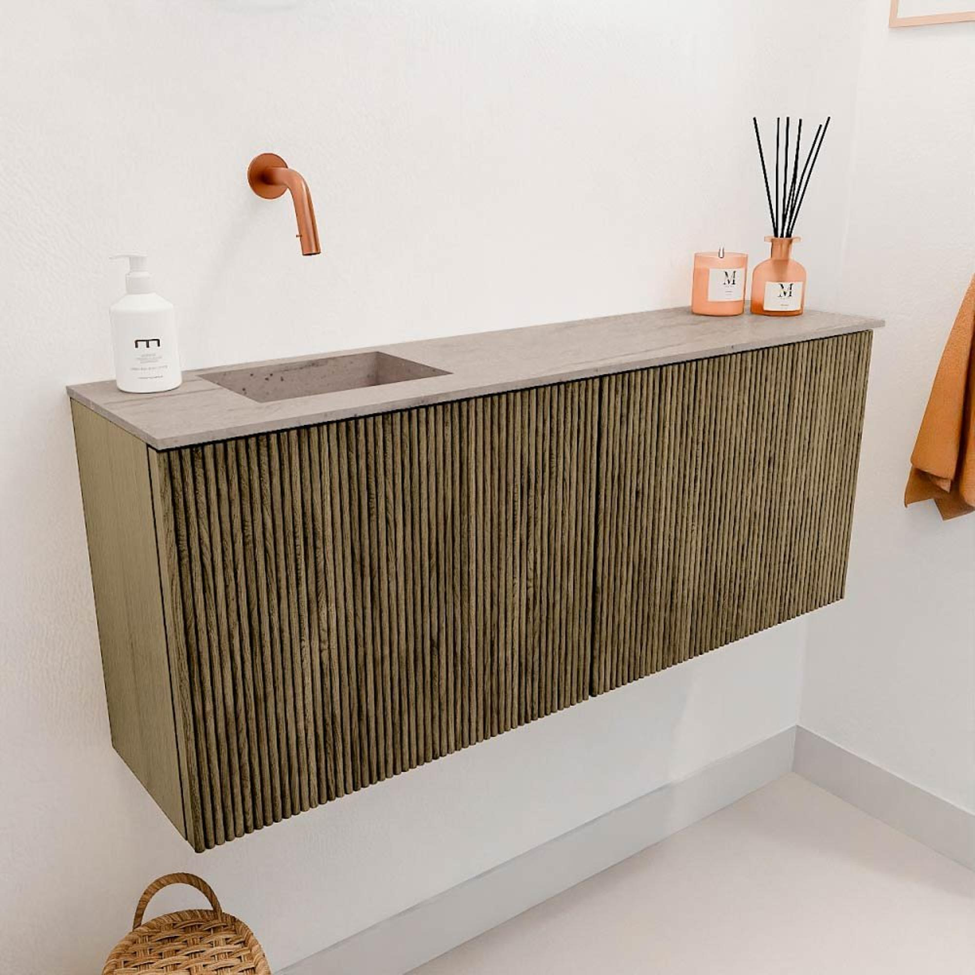 La combinaison de la couleur profonde et naturelle Dusk avec le chêne massif fait de ce meuble un véritable point de mire. Les détails de rainures verticales donnent à l'ensemble un aspect raffiné et moderne, qui ajoute en même temps chaleur et caractère. Grâce au design subtil, le meuble s'intègre aussi bien dans une salle de bains moderne et épurée que dans un cadre plus classique. La vasque de couleur Saba ajoute une touche douce et élégante qui s'accorde parfaitement avec les tons naturels du bois. Ainsi, vous profitez d'un meuble de salle de bains qui n'est pas seulement fonctionnel, mais qui fait aussi une déclaration de style.