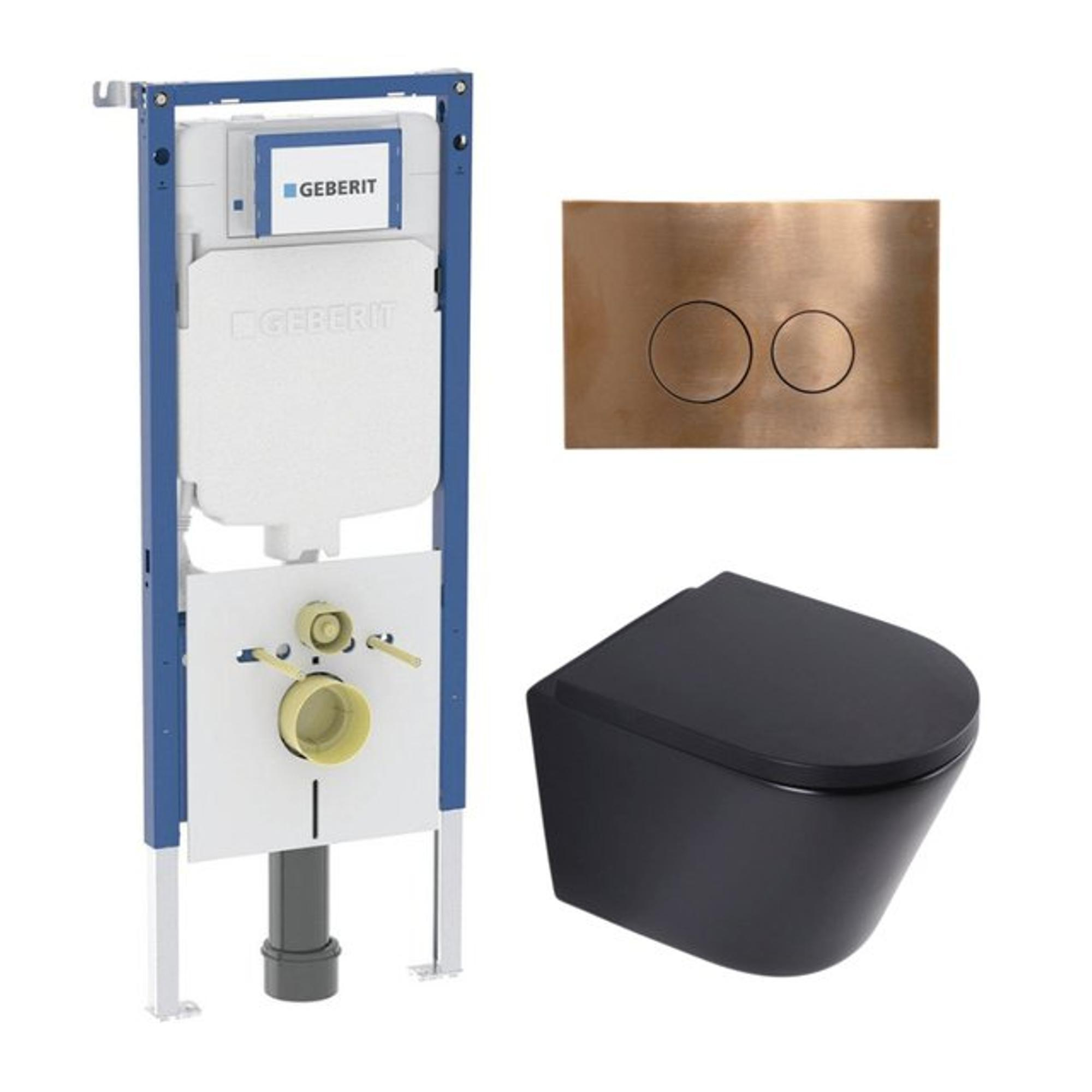 QeramiQ Dely Toiletset - 36.3x51.7cm - diepspoel - rimless - Geberit UP720 inbouwreservoir - softclose toilet zitting 35 mm - koperen bedieningsplaat - ronde knoppen - mat zwart