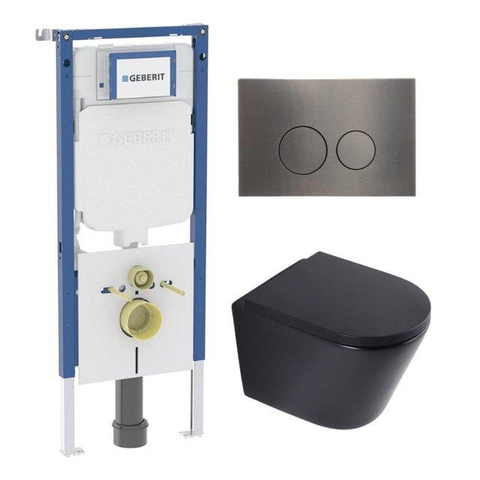 QeramiQ Dely Toiletset - 36.3x51.7cm - diepspoel - rimless - Geberit UP720 inbouwreservoir - softclose toilet zitting 35 mm - gunmetal bedieningsplaat - ronde knoppen - mat zwart