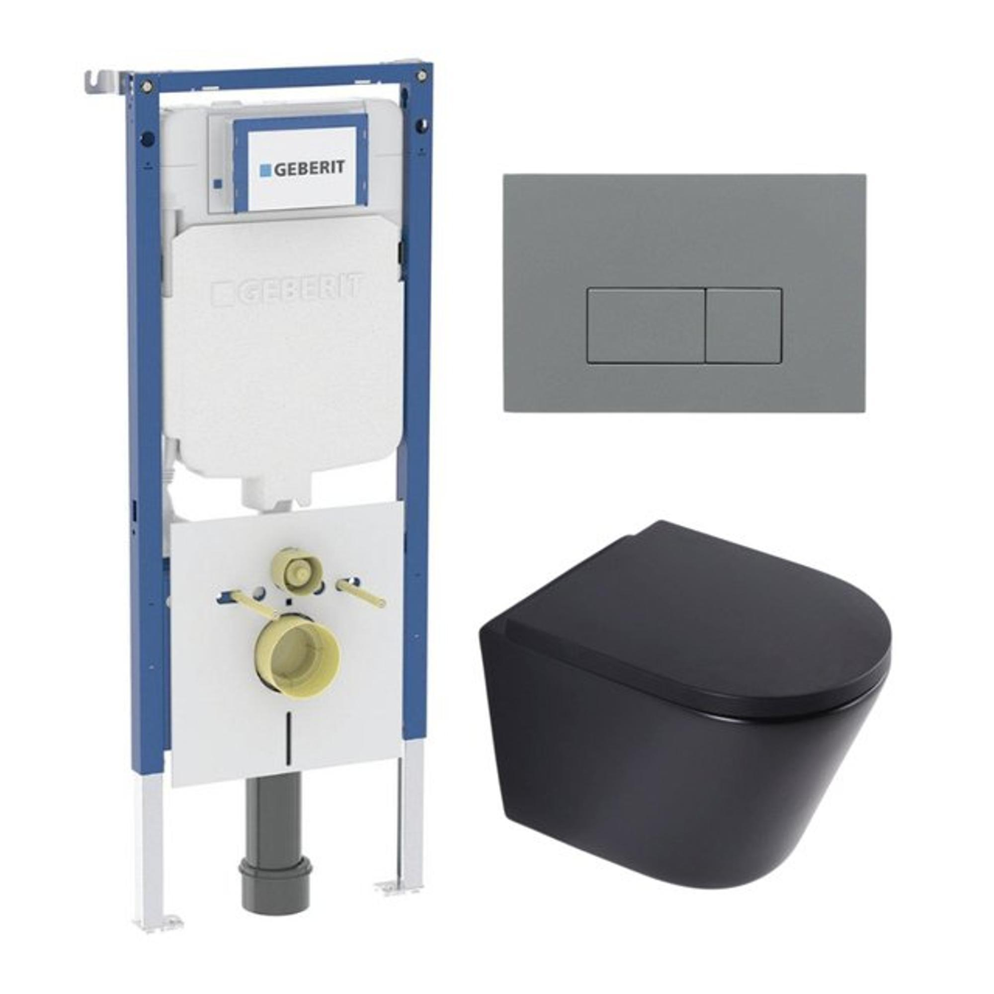 QeramiQ Dely Pack WC - 36.3x51.7cm - à fond creux - sans bride - réservoir attenant Geberit UP320 - abattant WC à fermeture douce - plaque de commande gris clair - boutons rectangulaires - noir mat
