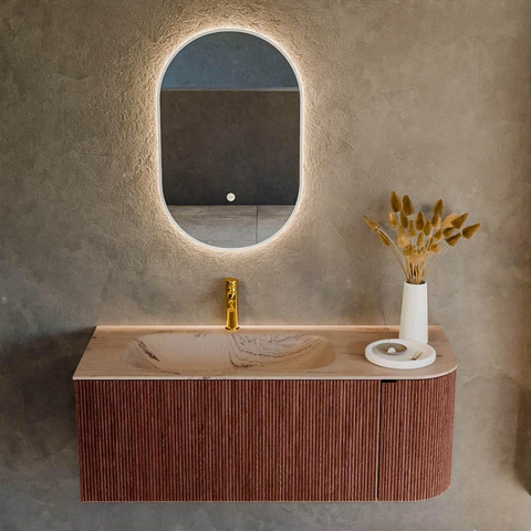 MONDIAZ KURVE-DLUX 115cm badmeubel ronding Rechts kleur Ruby met 1 lade en 1 deur. Wastafel BIG SMALL Links 1 kraangat Arena.