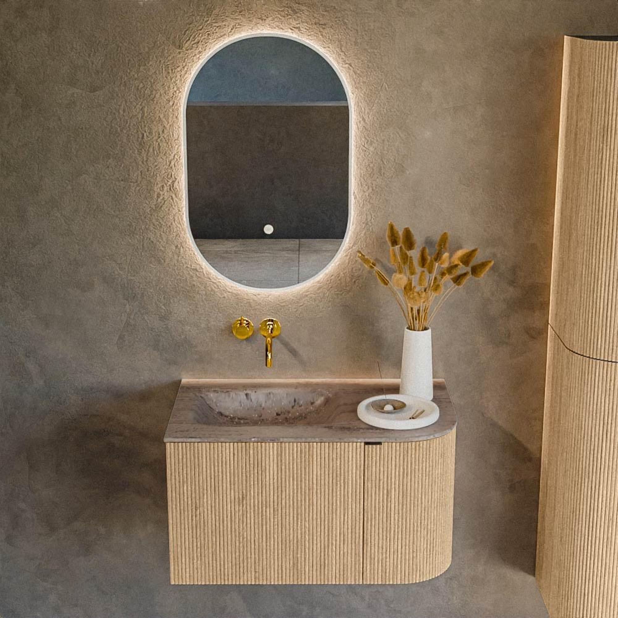 MONDIAZ KURVE-DLUX 75cm badmeubel ronding Rechts kleur Oak met 1 lade en 1 deur. Wastafel GRUNNE Links zonder kraangat Oza.