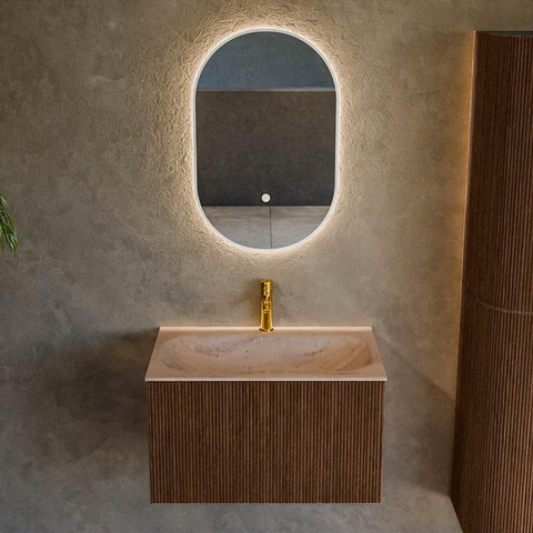 MONDIAZ KURVE-DLUX 70cm badmeubel kleur Walnut met 1 lade en 0 deuren. Wastafel BIG SMALL Midden 1 kraangat Saba.