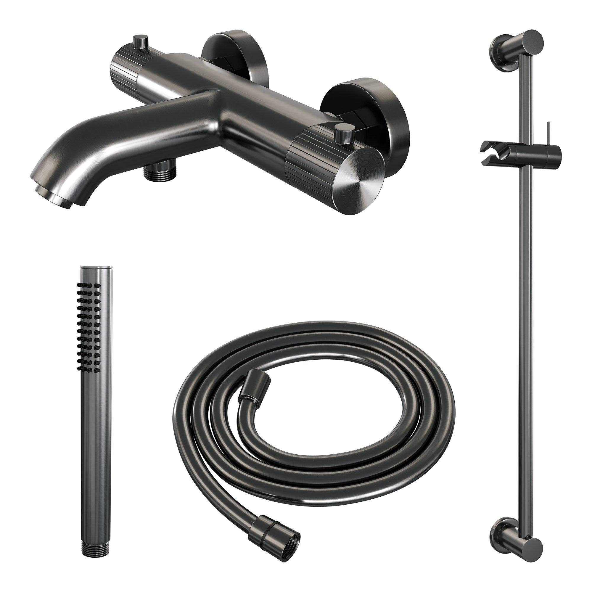 Avec cet ensemble complet, transformez votre salle de bains en une oasis de confort et de style. La combinaison d’un mitigeur thermostatique avec une barre coulissante, une douchette à main et un flexible de douche vous offre un contrôle ultime sur votre expérience de douche. Grâce aux matériaux de haute qualité et à la finition raffinée en gunmetal brossé PVD, votre salle de bains acquiert une apparence moderne et intemporelle qui s’adapte aisément à différents styles d’intérieur. Chaque douche devient un moment de détente et de luxe, où fonctionnalité et design se conjuguent parfaitement. Cet ensemble est non seulement pratique, mais aussi un véritable élément phare qui élève votre salle de bains à un niveau supérieur.