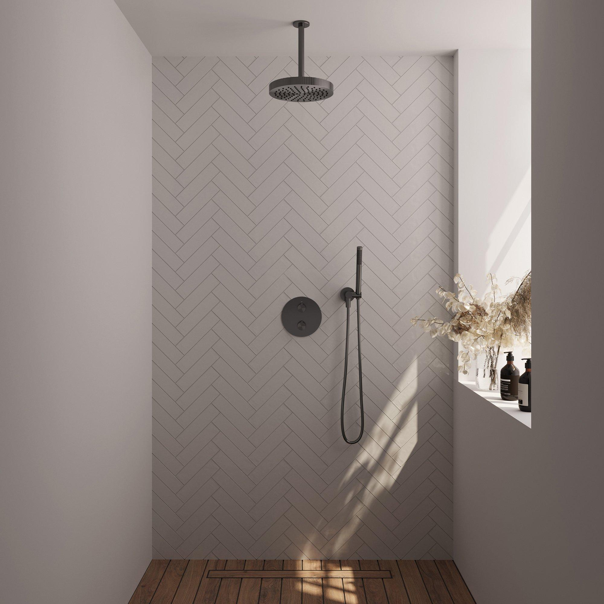 Cette douche de tête est un exemple de design intemporel et de finition raffinée. La couleur gunmetal avec couche PVD brossée offre un aspect mat et élégant qui est non seulement beau à voir, mais aussi résistant aux rayures et aux empreintes digitales. Le design rond de la pomme de douche et les lignes épurées du bras plafond et de la douchette créent une atmosphère harmonieuse et moderne. Vous ajoutez ainsi un élément accrocheur et stylé à votre salle de bains qui se combine facilement avec d’autres éléments et accessoires.