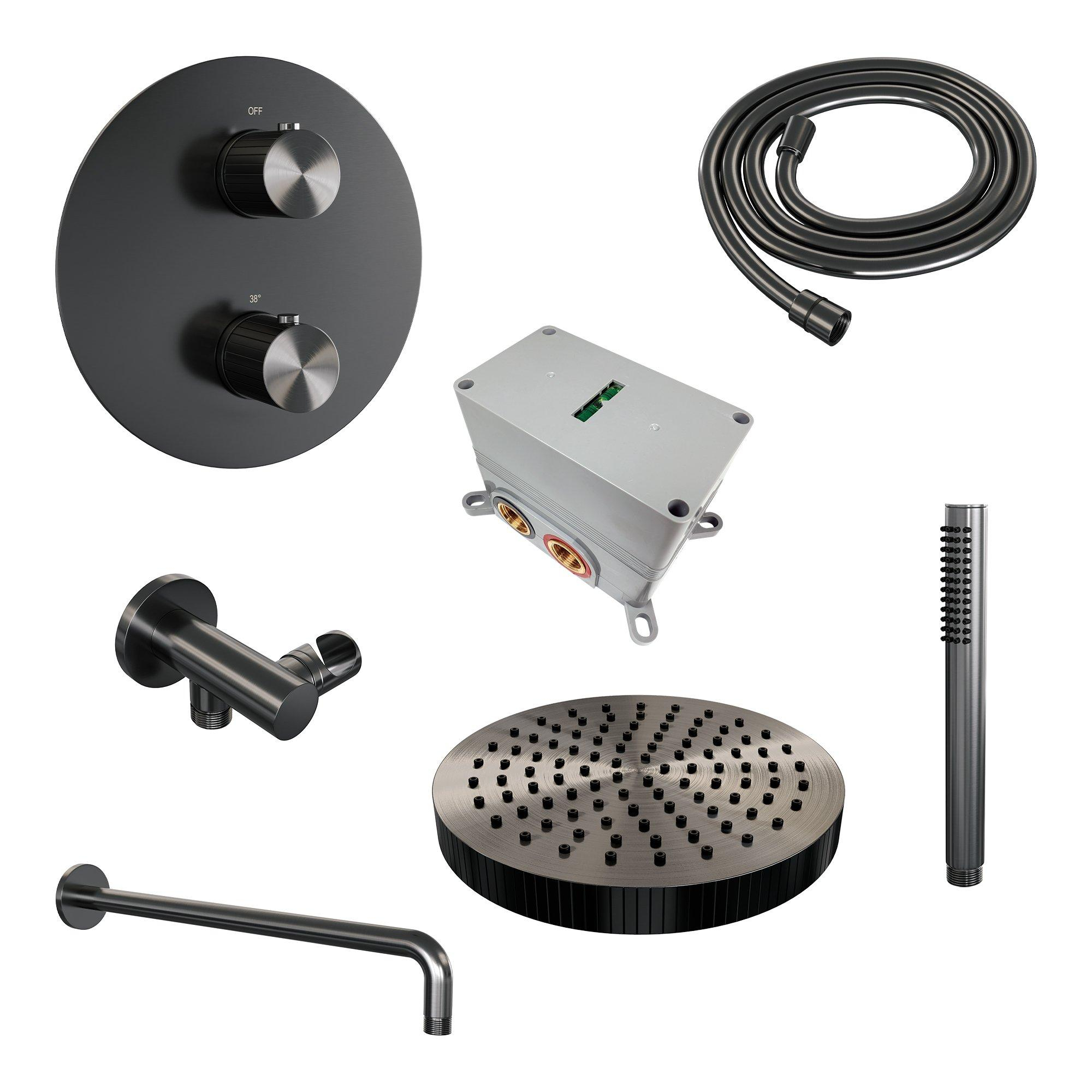 BRAUER Stripe Douche de tête thermostatique encastrée - 3 voies - ronde - SET 38 - pomme de douche 25 cm - bras mural courbé - douchette à main barre - flexible de douche - coude de raccord mural - gunmetal brossé PVD
