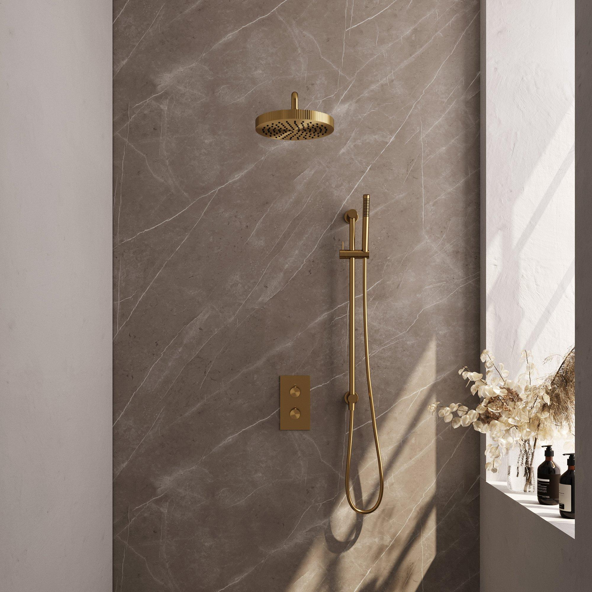 BRAUER Stripe Douche de tête thermostatique encastrable - 3 voies - rectangulaire - pomme de douche 25 cm - bras mural courbé - douchette à main sur barre - flexible de douche - barre coulissante intégrée - PVD brossé or