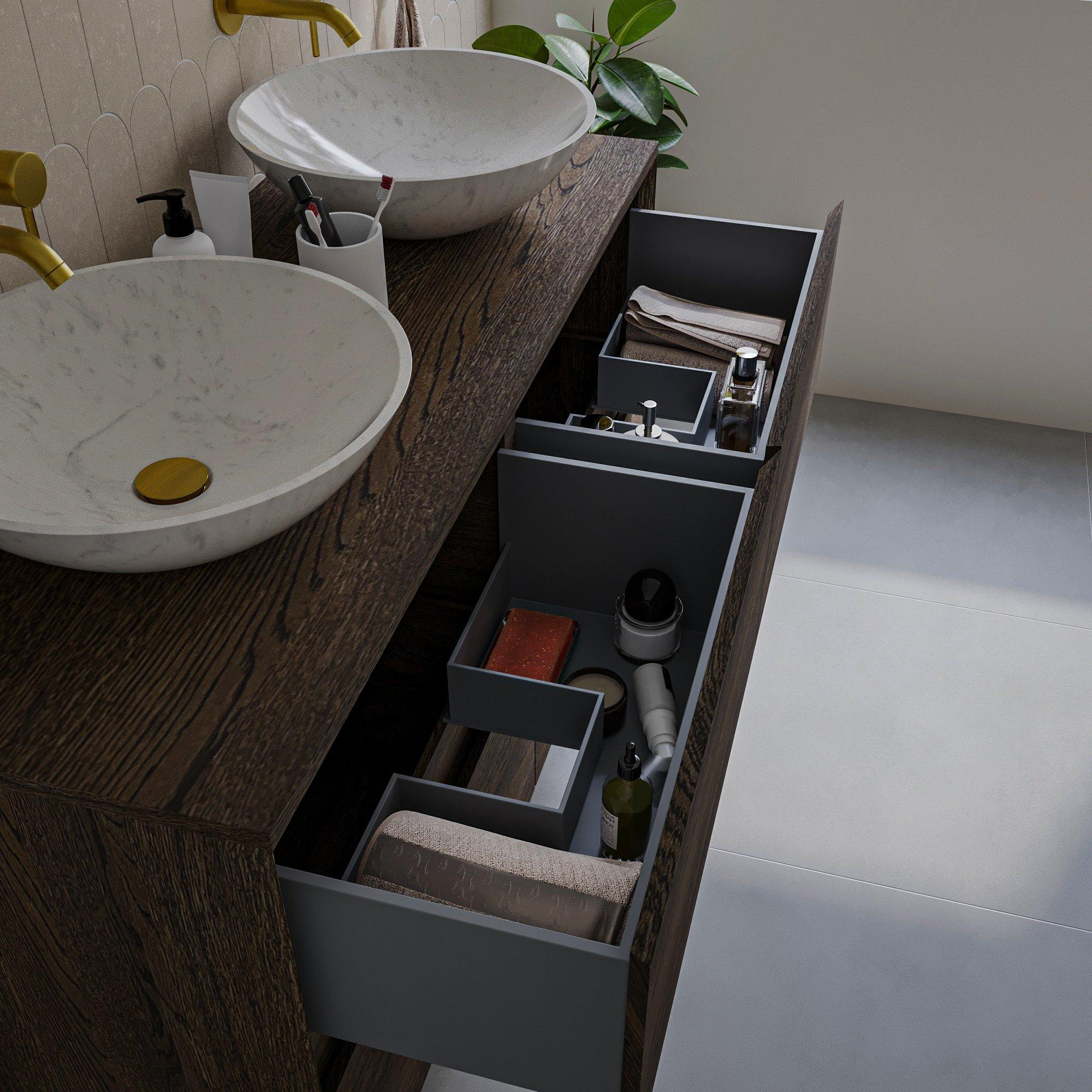 La combinaison de chêne massif avec une finition charcoal donne à cet ensemble meuble une apparence naturelle et pourtant contemporaine. Le bois crée une ambiance chaleureuse, tandis que le design épuré et les tiroirs sans poignée assurent un look minimaliste et moderne. Vous ajoutez ainsi un élément stylé qui s'adapte facilement à différents styles de salle de bains, du classique à l'industriel. Ce meuble est un véritable point focal qui donne à votre salle de bains une allure luxueuse sans dominer.