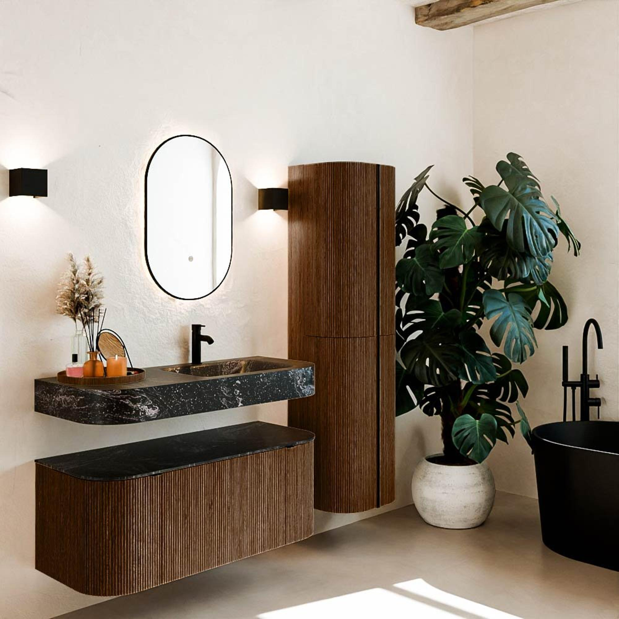 Matériaux naturels aux teintes chaudes. Les nervures verticales apportent rythme et texture au design, tandis que le chêne confère une apparence chaleureuse et artisanale. Choisissez parmi 5 teintes de bois OAK, WALNUT, DUSK, SHADOW et RUBY, des couleurs de bois soigneusement sélectionnées pour enrichir les salles de bains modernes et classiques.
