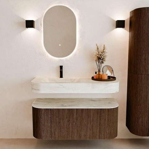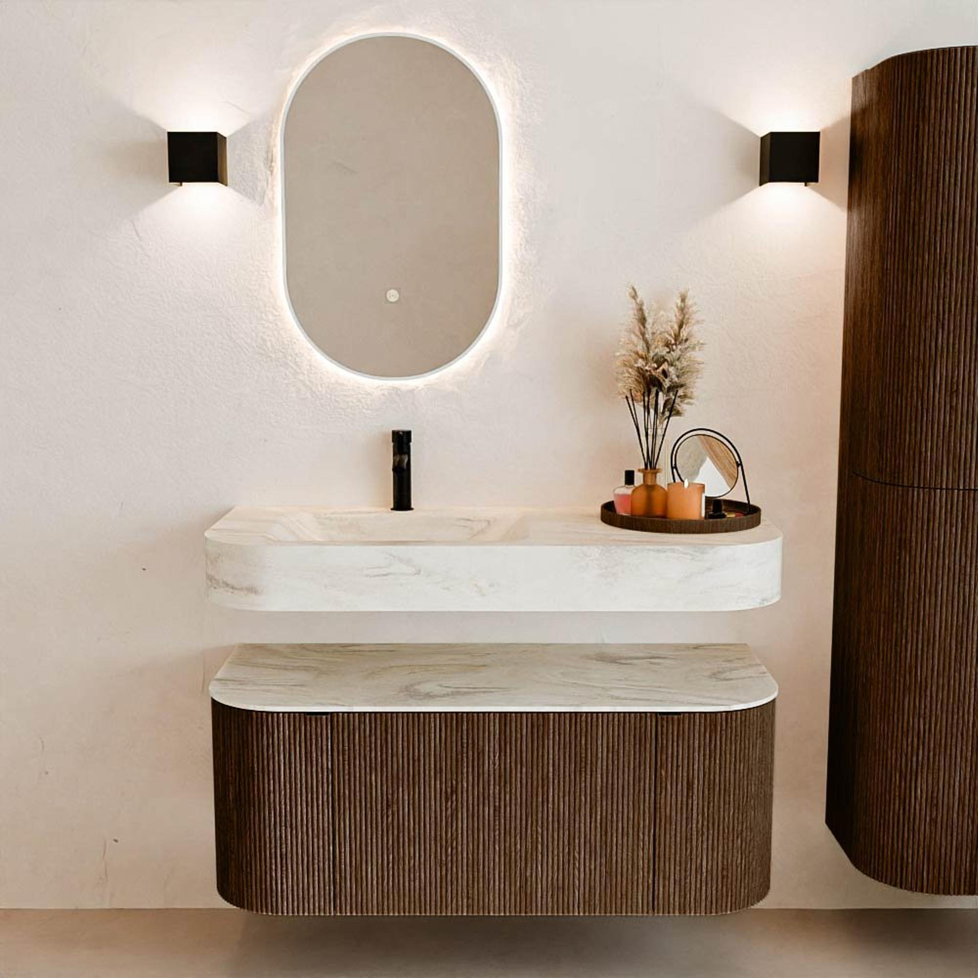 Matériaux naturels dans des tons chauds. Les nervures verticales apportent rythme et texture au design, tandis que le chêne confère une apparence chaleureuse et artisanale. Choisissez parmi 5 teintes de bois OAK, WALNUT, DUSK, SHADOW et RUBY, des couleurs de bois soigneusement sélectionnées pour enrichir les salles de bains modernes et classiques.