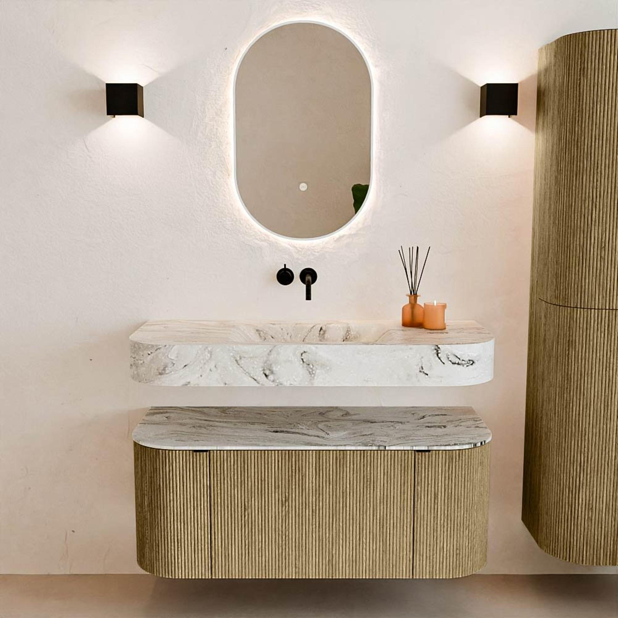 Matériaux naturels dans des tons chauds. Les nervures verticales apportent rythme et texture au design, tandis que le chêne confère une apparence chaleureuse et artisanale. Choisissez parmi 5 teintes de bois OAK, WALNUT, DUSK, SHADOW et RUBY, des couleurs de bois soigneusement sélectionnées pour enrichir les salles de bains modernes et classiques.