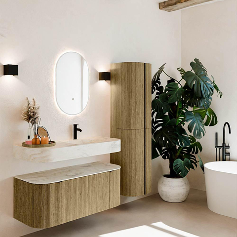 Matériaux naturels dans des tons chauds. Les nervures verticales apportent rythme et texture au design, tandis que le chêne confère une apparence chaleureuse et artisanale. Choisissez parmi 5 teintes de bois OAK, WALNUT, DUSK, SHADOW et RUBY, des couleurs de bois soigneusement sélectionnées pour enrichir les salles de bains modernes et classiques.
