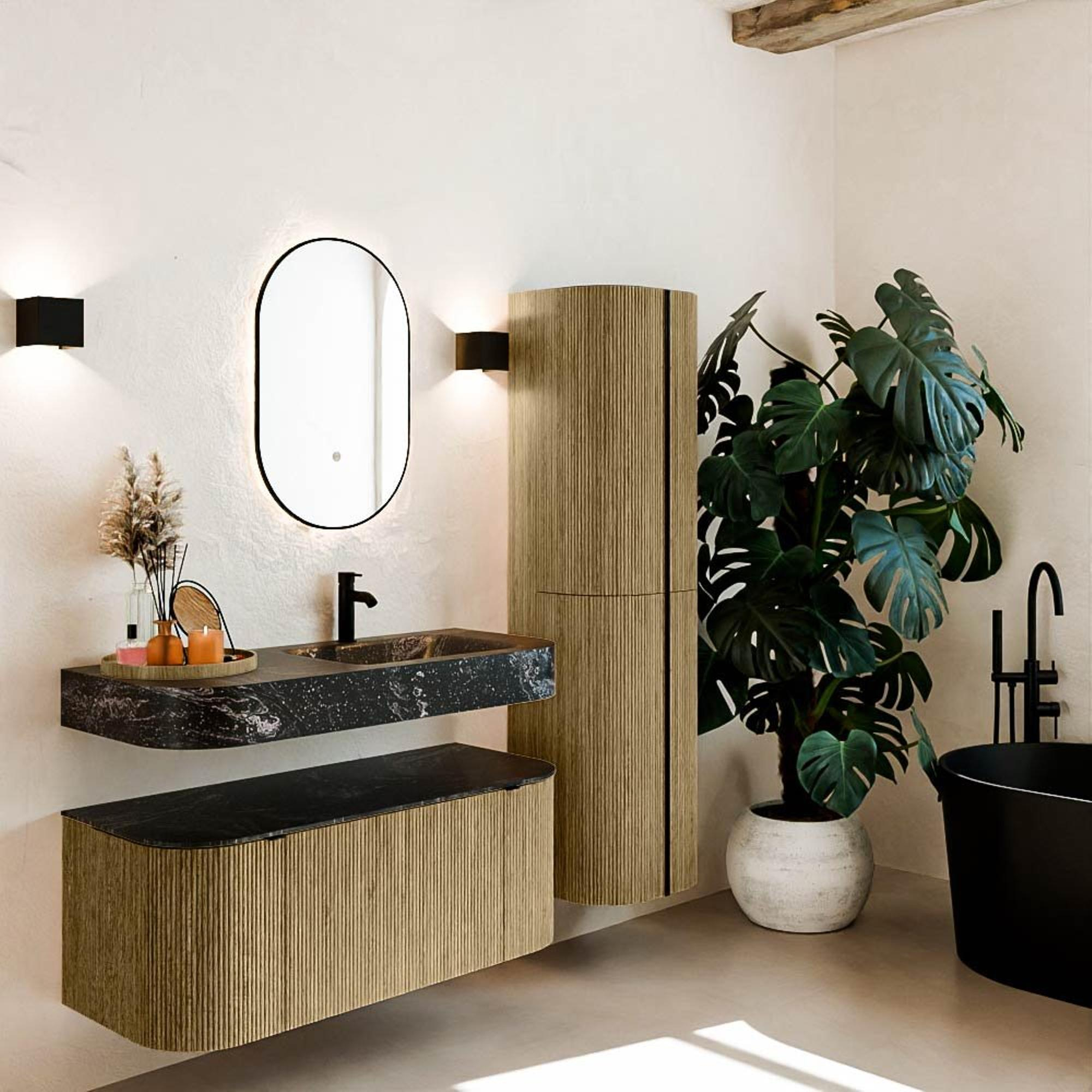 Matériaux naturels dans des tons chauds. Les nervures verticales apportent rythme et texture au design, tandis que le chêne confère une apparence chaleureuse et artisanale. Choisissez parmi 5 teintes de bois OAK, WALNUT, DUSK, SHADOW et RUBY, des couleurs de bois soigneusement sélectionnées pour enrichir les salles de bains modernes et classiques.