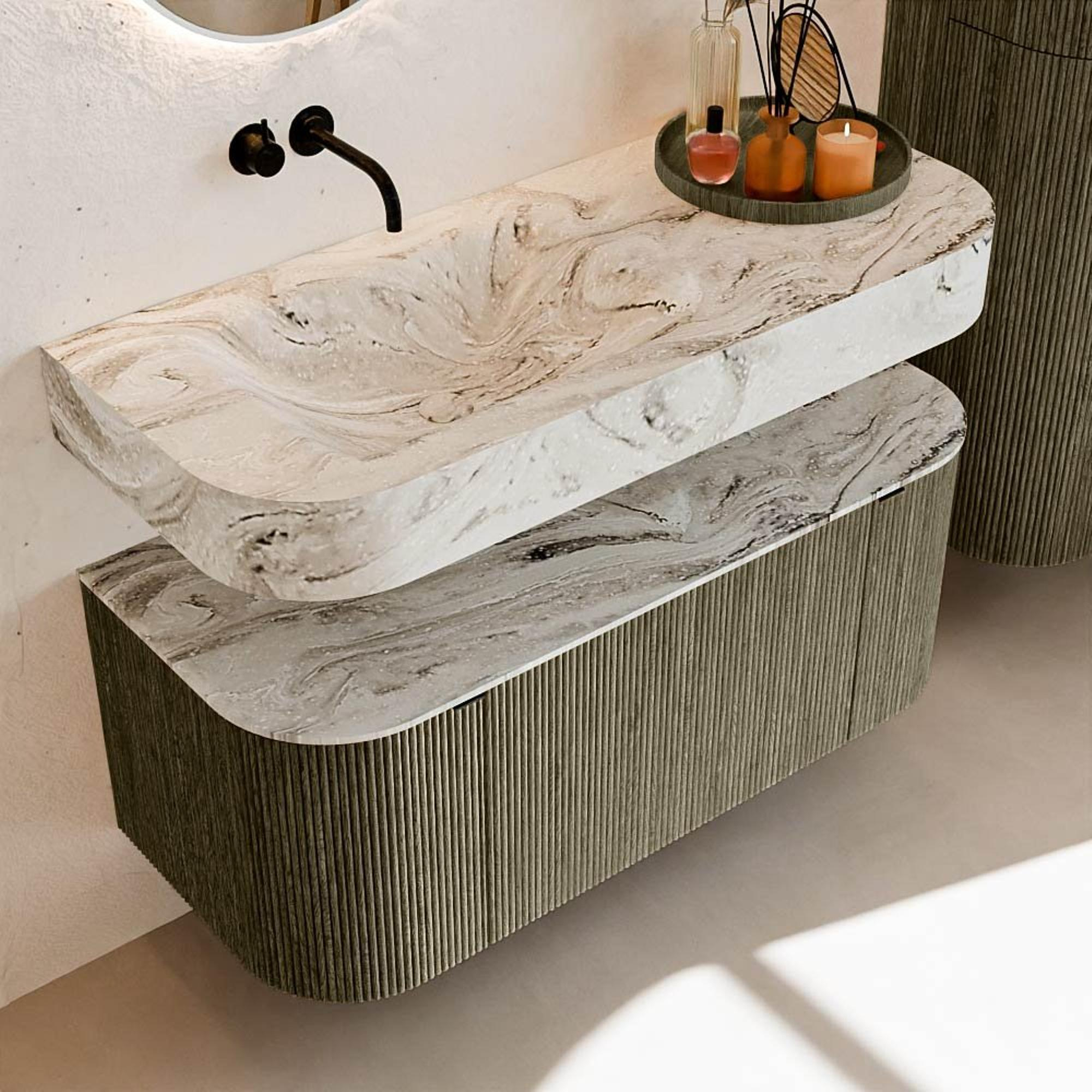 Au-dessus du meuble flotte une vasque suspendue assortie aux coins arrondis – parfaitement adaptée à la forme du meuble. La vasque est en Solid Surface et suit subtilement les lignes du meuble inférieur, créant une harmonie parfaite. Le plan de travail en Solid Surface constitue une base solide, facile d'entretien et complète la combinaison.