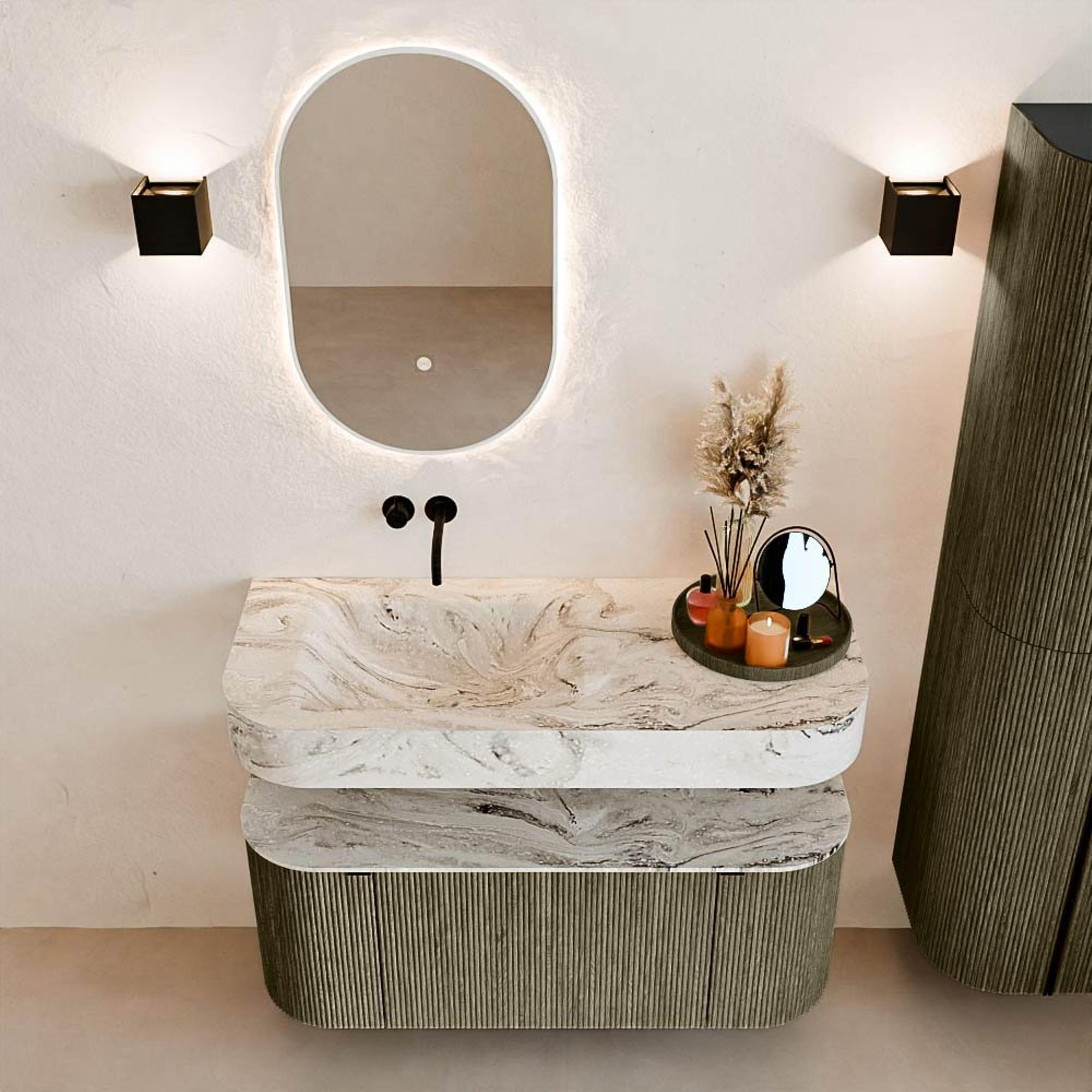 Matériaux naturels dans des tons chauds. Les nervures verticales apportent rythme et texture au design, tandis que le chêne confère une apparence chaleureuse et artisanale. Choisissez parmi 5 teintes de bois OAK, WALNUT, DUSK, SHADOW et RUBY, des couleurs de bois soigneusement sélectionnées pour enrichir les salles de bains modernes et classiques.