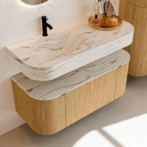 Au-dessus du meuble flotte une vasque suspendue assortie aux coins arrondis – parfaitement adaptée à la forme du meuble. La vasque est réalisée en Solid Surface et suit subtilement les lignes du meuble inférieur, créant ainsi un ensemble harmonieux. Le plan de travail en Solid Surface constitue une base solide et facile d'entretien, complétant la combinaison.