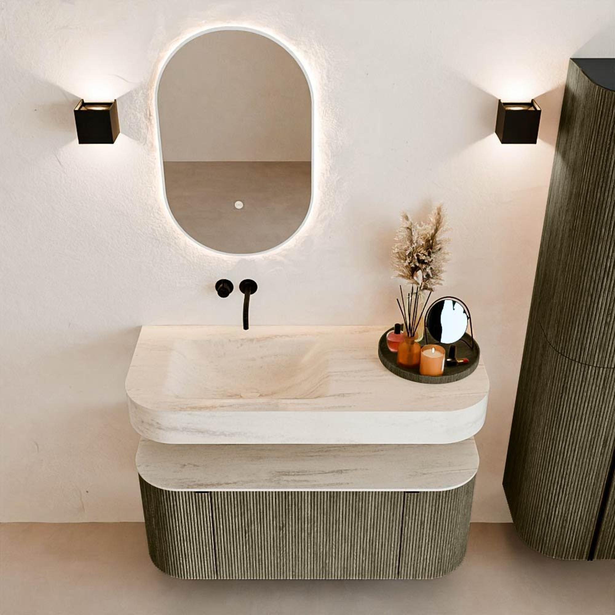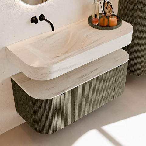 Matériaux naturels dans des tons chauds. Les cannelures verticales apportent rythme et texture au design, tandis que le chêne confère une apparence chaleureuse et artisanale. Choisissez parmi 5 teintes de bois OAK, WALNUT, DUSK, SHADOW et RUBY, des couleurs de bois soigneusement sélectionnées pour enrichir les salles de bains modernes et classiques.