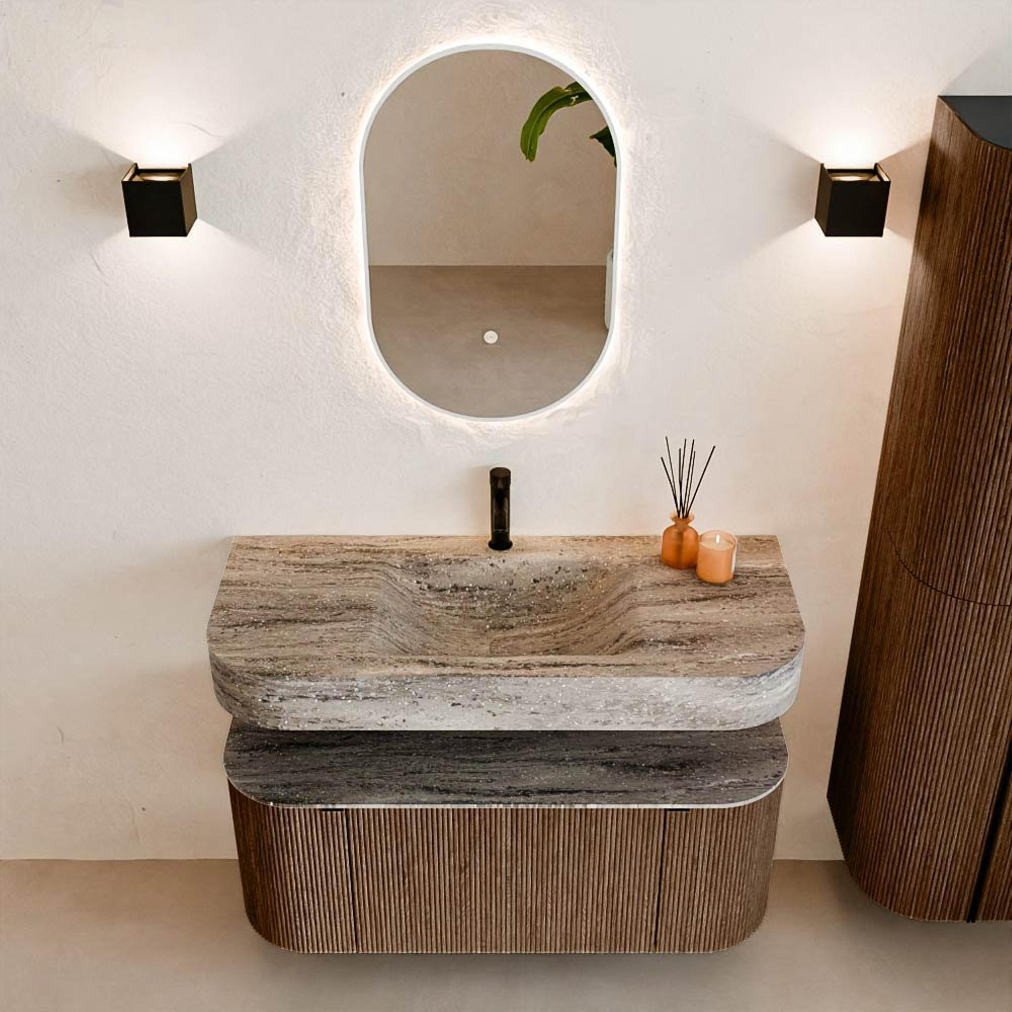 Matériaux naturels dans des teintes chaudes. Les rainures verticales apportent rythme et texture au design, tandis que le chêne confère une apparence chaleureuse et artisanale. Choisissez parmi 5 teintes de bois OAK, WALNUT, DUSK, SHADOW et RUBY, des couleurs de bois soigneusement sélectionnées pour enrichir les salles de bains modernes et classiques.
