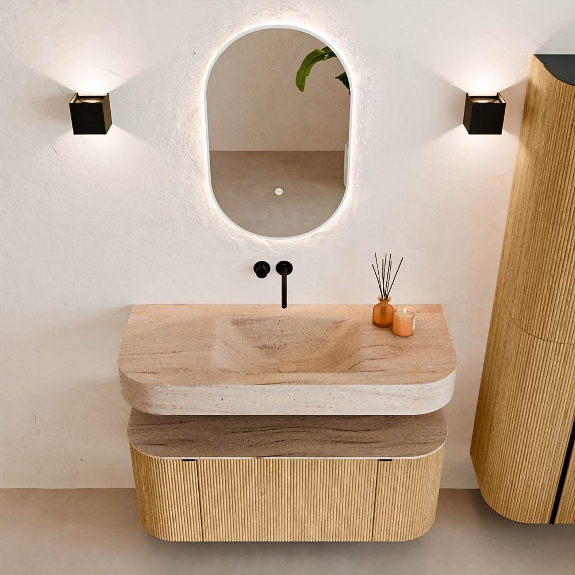 Matériaux naturels dans des tons chauds. Les cannelures verticales apportent rythme et texture au design, tandis que le chêne confère une apparence chaleureuse et artisanale. Choisissez parmi 5 teintes de bois OAK, WALNUT, DUSK, SHADOW et RUBY, des couleurs de bois soigneusement sélectionnées pour enrichir les salles de bains modernes et classiques.