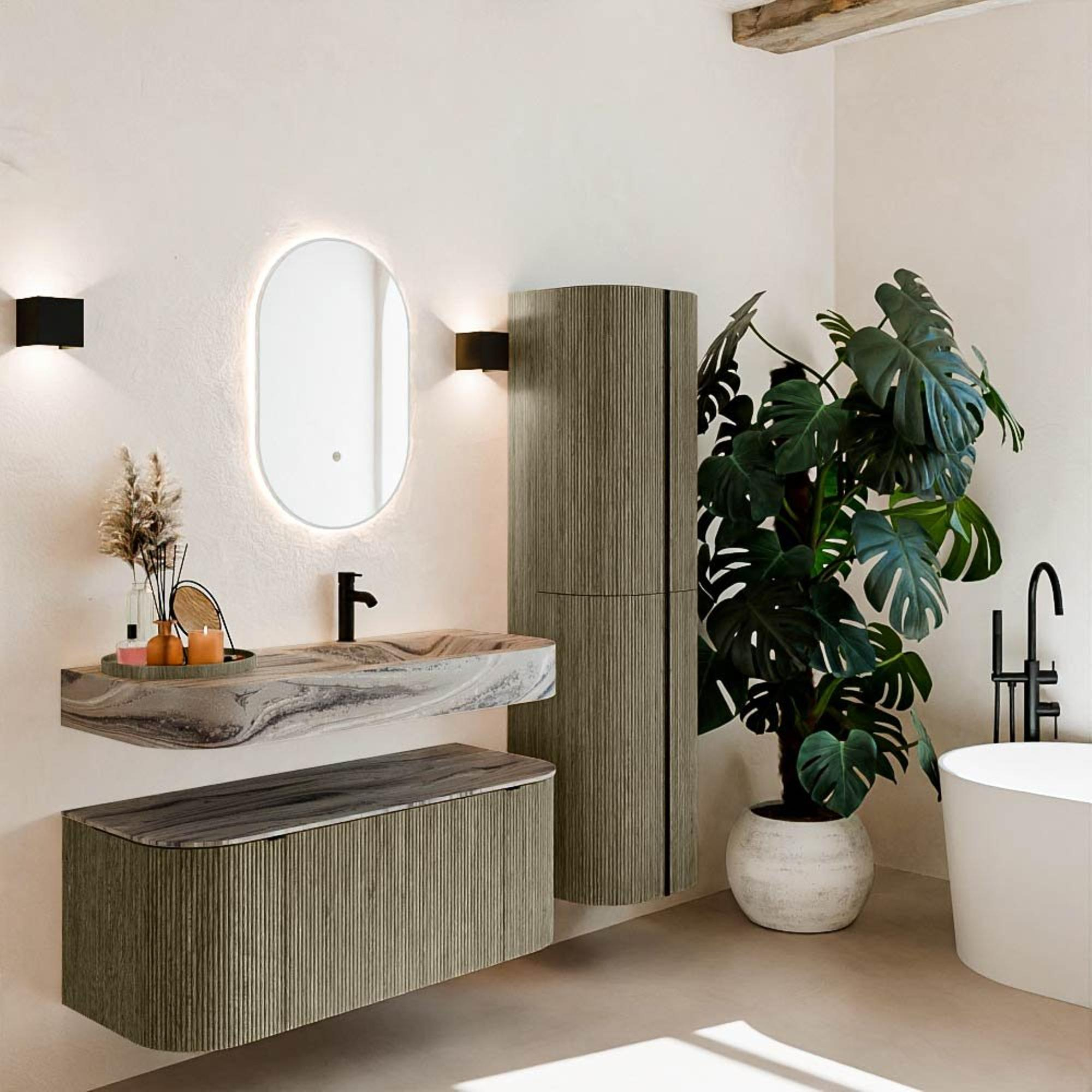 Matériaux naturels dans des tons chauds. Les rainures verticales apportent rythme et texture au design, tandis que le chêne confère une apparence chaleureuse et artisanale. Choisissez parmi 5 teintes de bois OAK, WALNUT, DUSK, SHADOW et RUBY, des couleurs de bois soigneusement sélectionnées pour enrichir les salles de bains modernes et classiques.