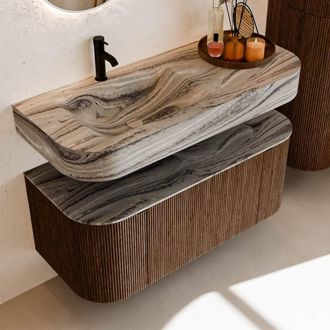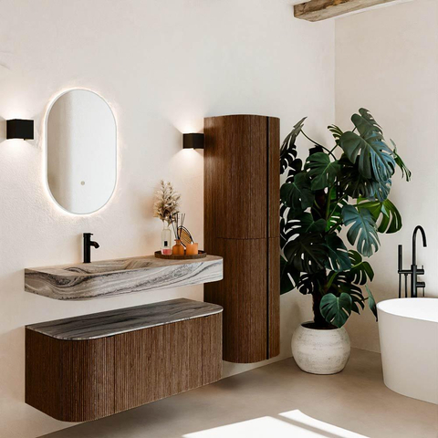 Matériaux naturels dans des tons chauds. Les cannelures verticales apportent rythme et texture au design, tandis que le chêne confère une apparence chaleureuse et artisanale. Choisissez parmi 5 teintes de bois OAK, WALNUT, DUSK, SHADOW et RUBY, des couleurs de bois soigneusement sélectionnées pour enrichir les salles de bains modernes et classiques.
