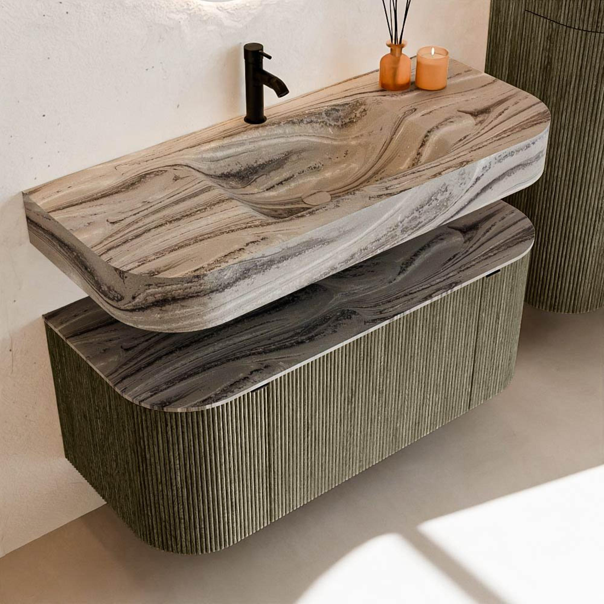 Matériaux naturels dans des tons chauds. Les reliefs verticaux apportent rythme et texture au design, tandis que le chêne confère une apparence chaleureuse et artisanale. Choisissez parmi 5 teintes de bois OAK, WALNUT, DUSK, SHADOW et RUBY, des couleurs de bois soigneusement sélectionnées pour enrichir les salles de bains modernes et classiques.