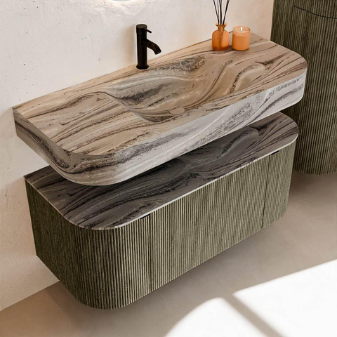 MONDIAZ THOR-DLUX Meuble de salle de bains 110cm arrondi gauche + droite couleur Shadow avec 1 tiroir et 2 portes. Vasque suspendue CLOUD Milieu 1 trou de robinet couleur Sombra.