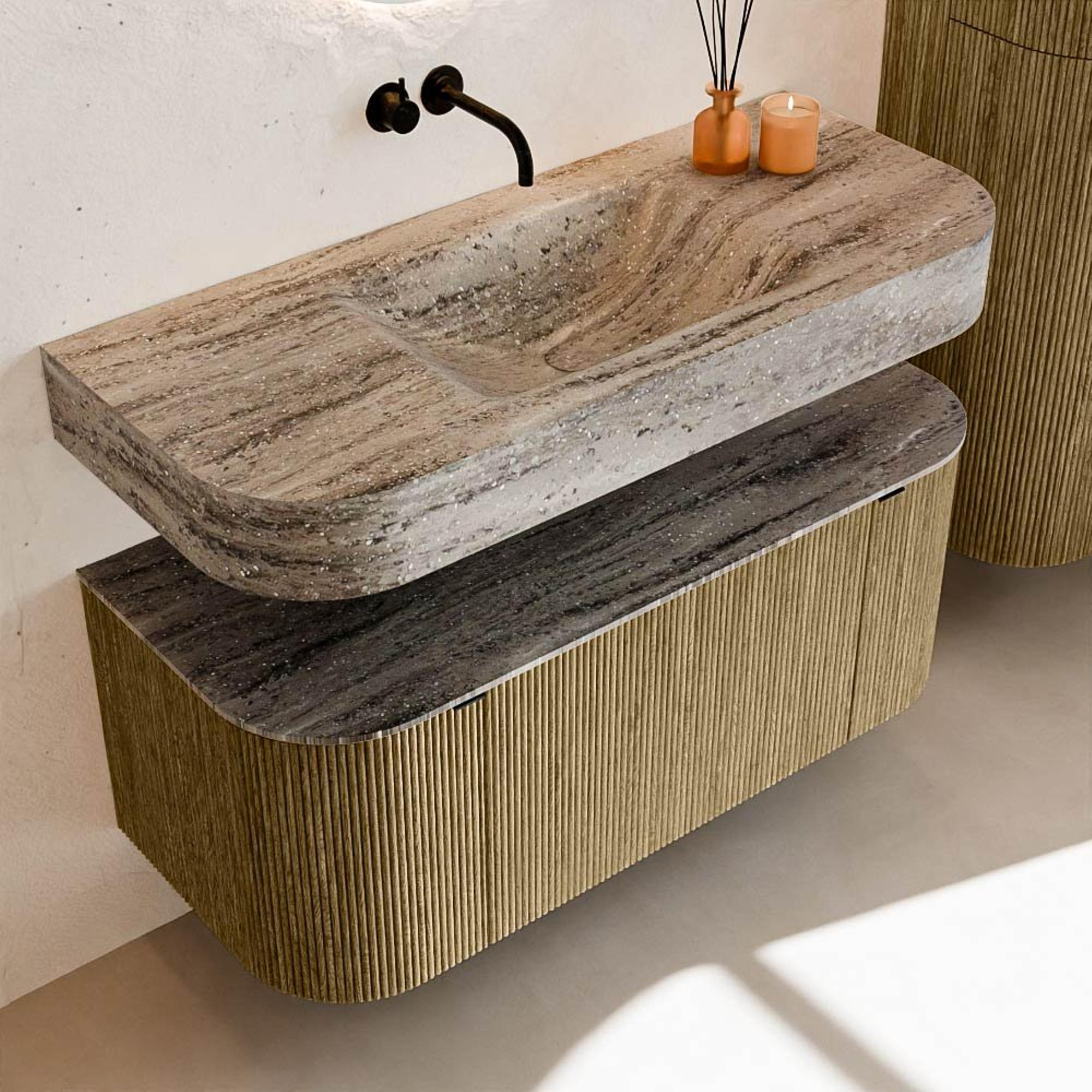 Matériaux naturels dans des tons chauds. Les nervures verticales apportent rythme et texture au design, tandis que le chêne confère une apparence chaleureuse et artisanale. Choisissez parmi 5 teintes de bois OAK, WALNUT, DUSK, SHADOW et RUBY, des couleurs de bois soigneusement sélectionnées pour enrichir les salles de bains modernes et classiques.